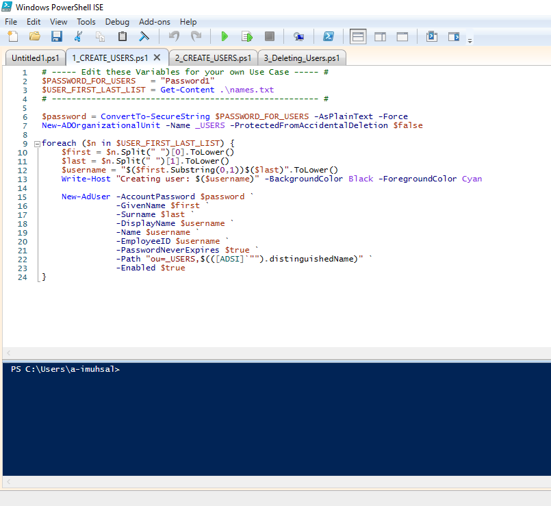 Dalam projek ini Josh menggunakan Script di PowerShell ISE untuk menambahkan banyak user, tetapi ketika user baru log in, user tidak disuruh untuk membuat password baru. Jadi hanya menggunakan password defaultnya yaitu “Password1”, yang di mana itu tidak aman untuk users maupun juga bagi perusahaan. Kemungkinan bisa saja ada orang yang jahil atau iseng menggunakannya id users lalu menggunakan password default dan ternyata bisa masuk dengan leluasa. Di sini saya mengubah script-nya dan juga saya membuat script untuk menghapus beberapa user yang sudah tidak lagi dipakai atau tidak lagi bekerja di perusahaan. Jadi total ada 3 script power shell yang saya akan perlihatkan