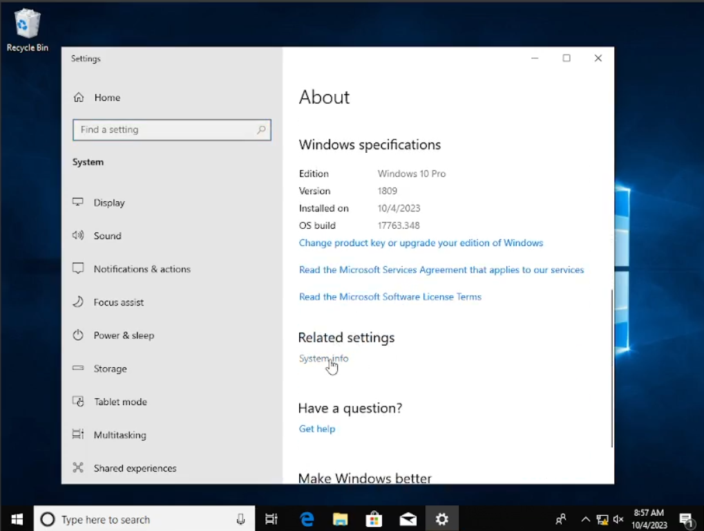 Sebenernya di sini ada sedikit kesalahan tapi kita lanjut saja sambil kita perbaiki. Konfigurasi pada Windows 10 pun hampir sama, kita akan install terlebih dahulu “Guest Adddtions” setelah itu pilih “I want reboot manually”. Kita akan ubah nama komputer ini dan memasukkannya ke dalam domain server. Klik kanan pada “Start” pilih “System” cari “System Info” yang berwarna biru. Setelah itu kita akan melihat spesifikasi komputer kita, lalu pilih saja “Change Settings” dan akan muncul windows baru.