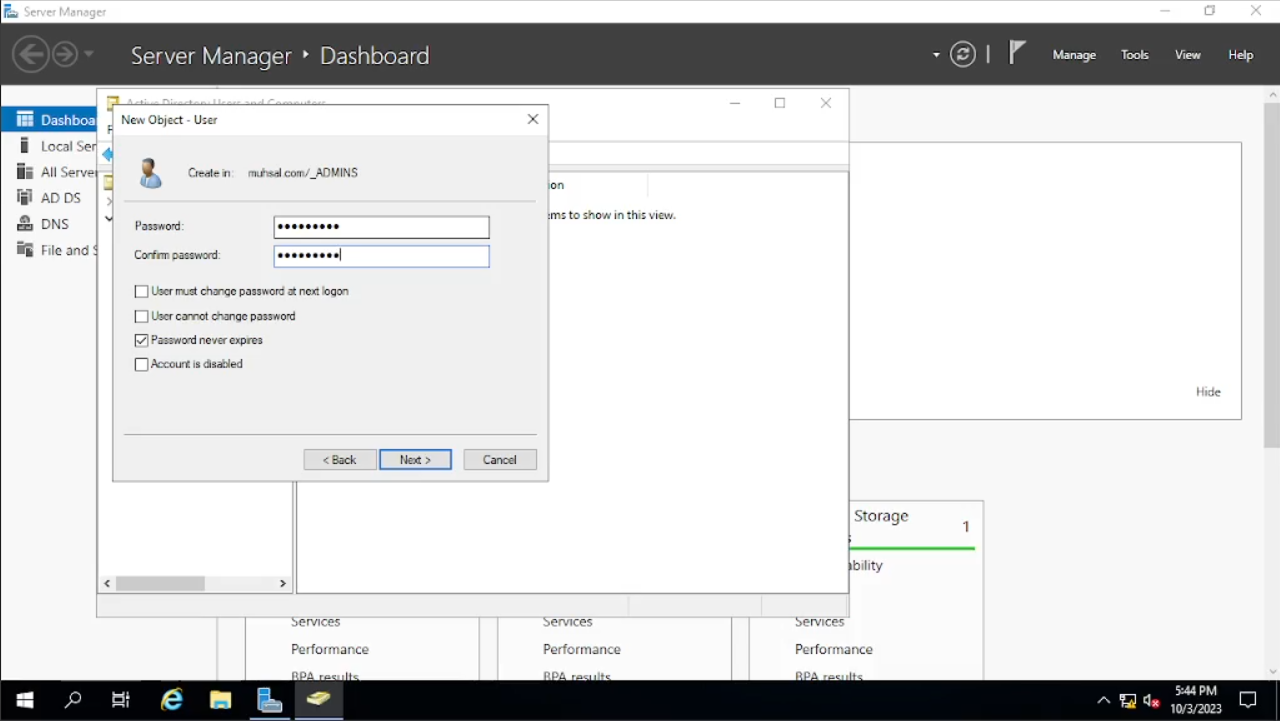 Setelah itu kita disuruh untuk memasukkan password, untuk tidak bingung saya akan menggunakan password yang sama yaitu “Password1”. Nah bisa kalian lihat ada 4 check box di sana, ini sebenernya bisa disesuaikan dengan kebijakan perusahaan dan yang akan kita pelajari ini adalah mengubah check box tersebut menggunakan Power Shell Script saat akan membuat user baru. Bila kita menonton video Josh, script power shell-nya hanya men-check “Password never expires” nanti kita akan perlihatkan dan untuk saat ini saya akan mengikutinya memilih “Password never expires” lalu “next” dan “finish”.