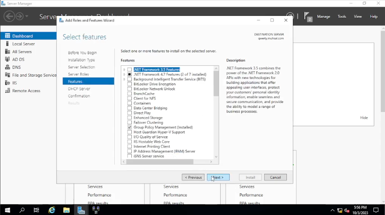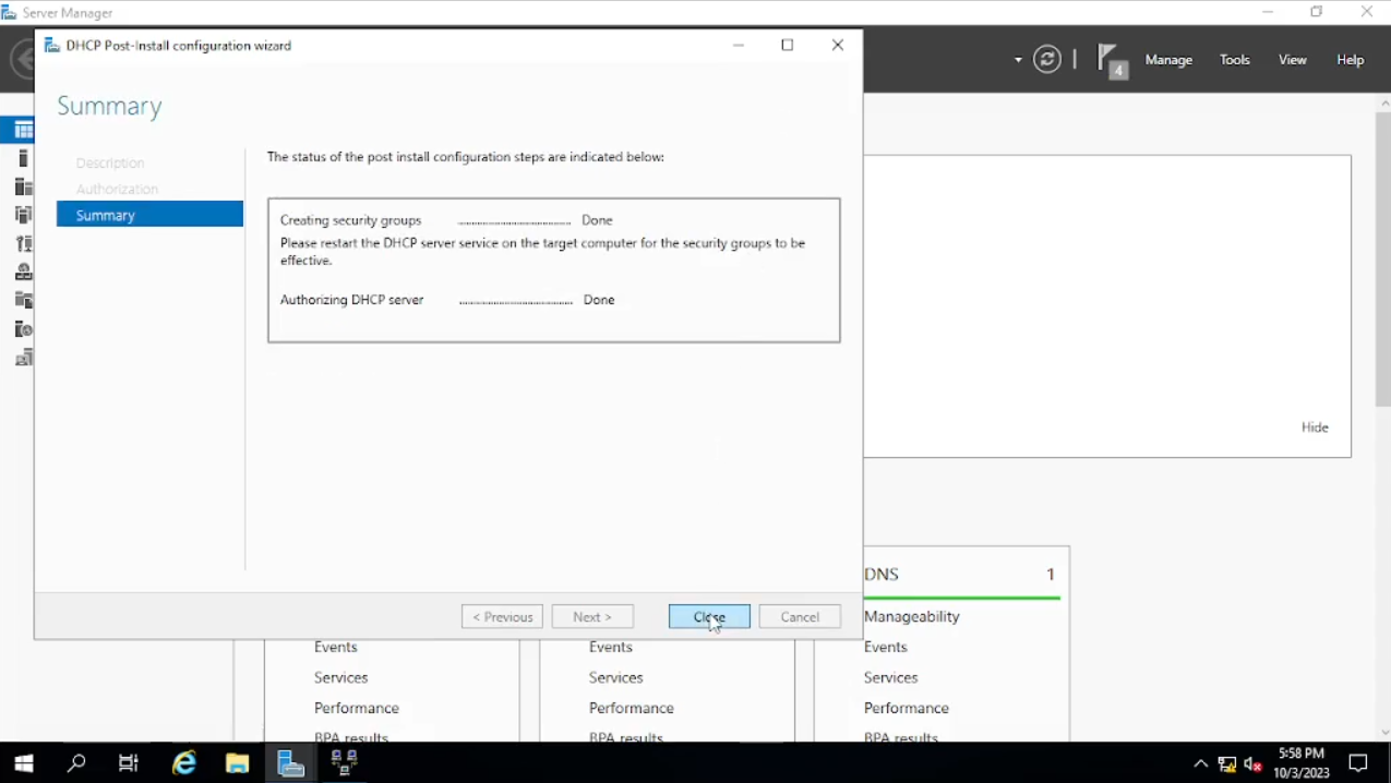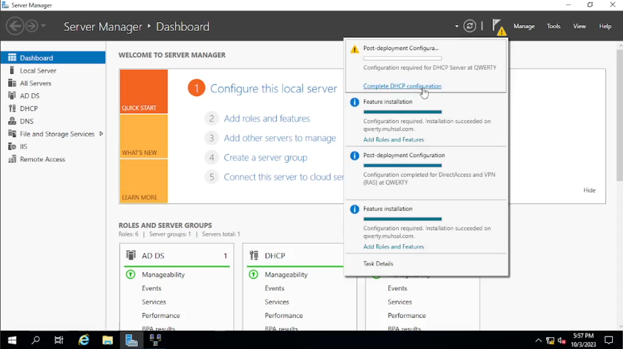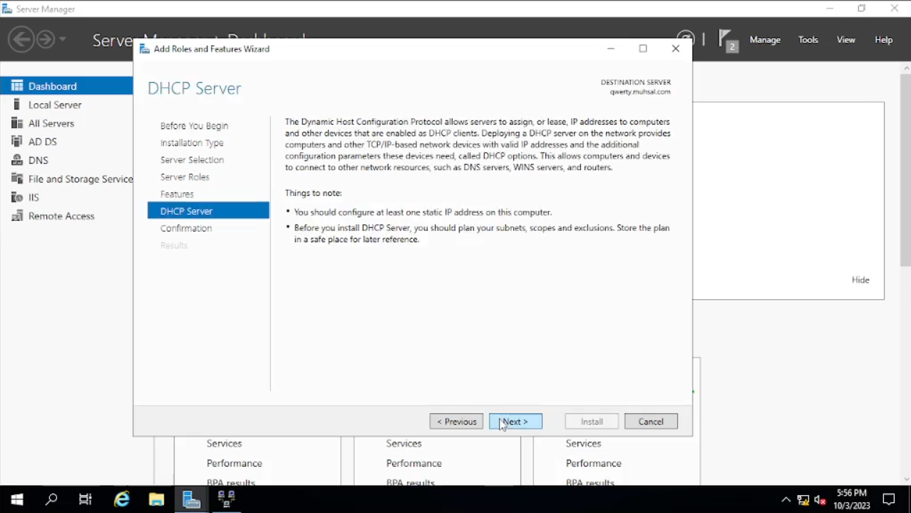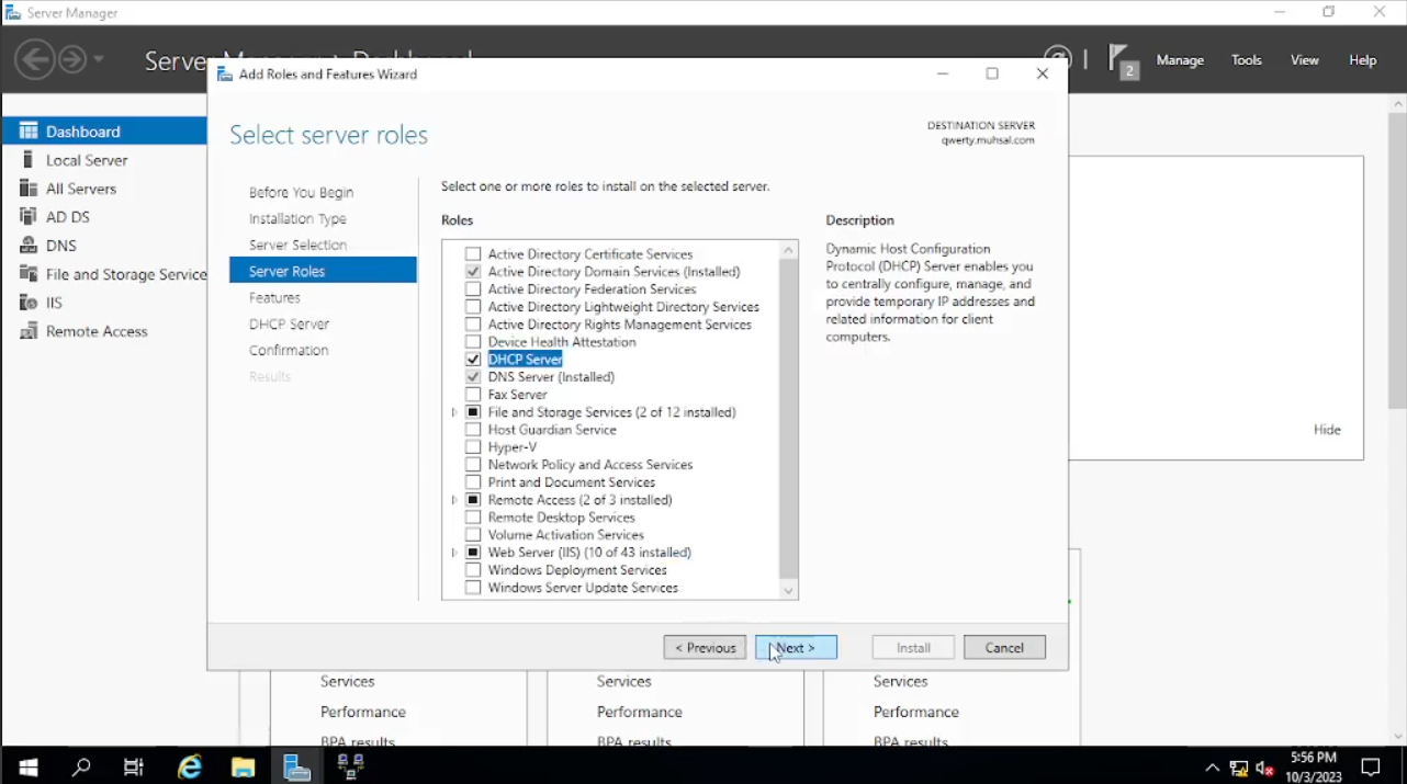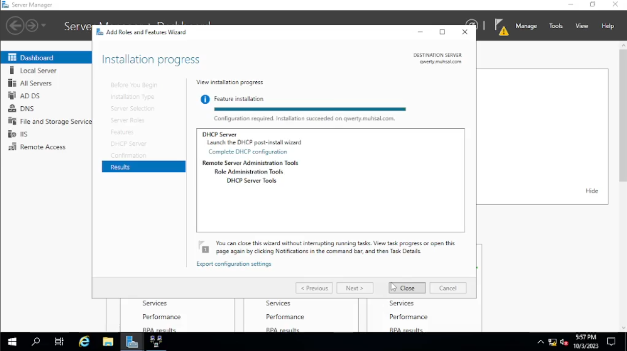Klik Pada “Add roles and Features” lalu klik “next” sampai “server roles” kita check “DHCP Server” dan klik “add features” lalu kita “next” sampai menuju “install”, setelah selesai kita close.