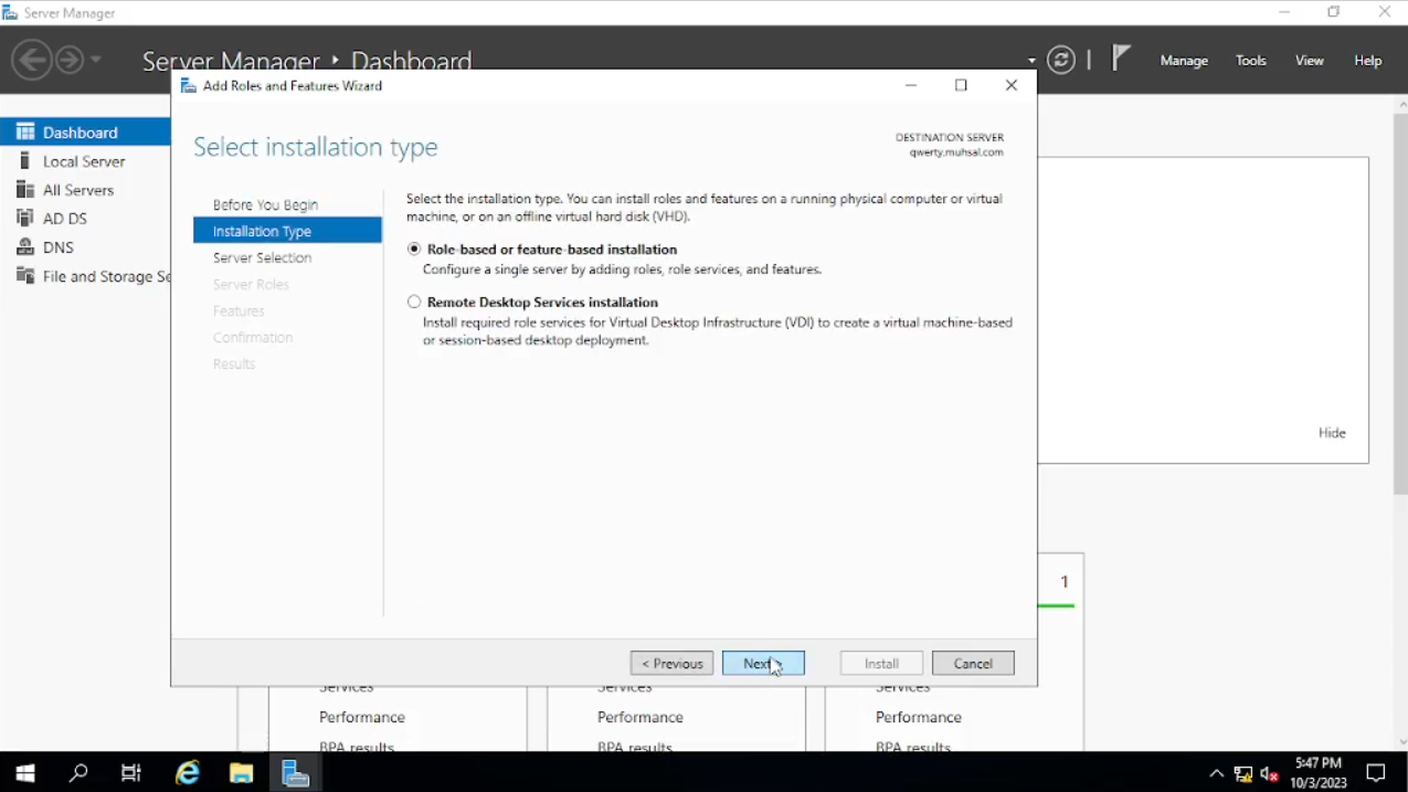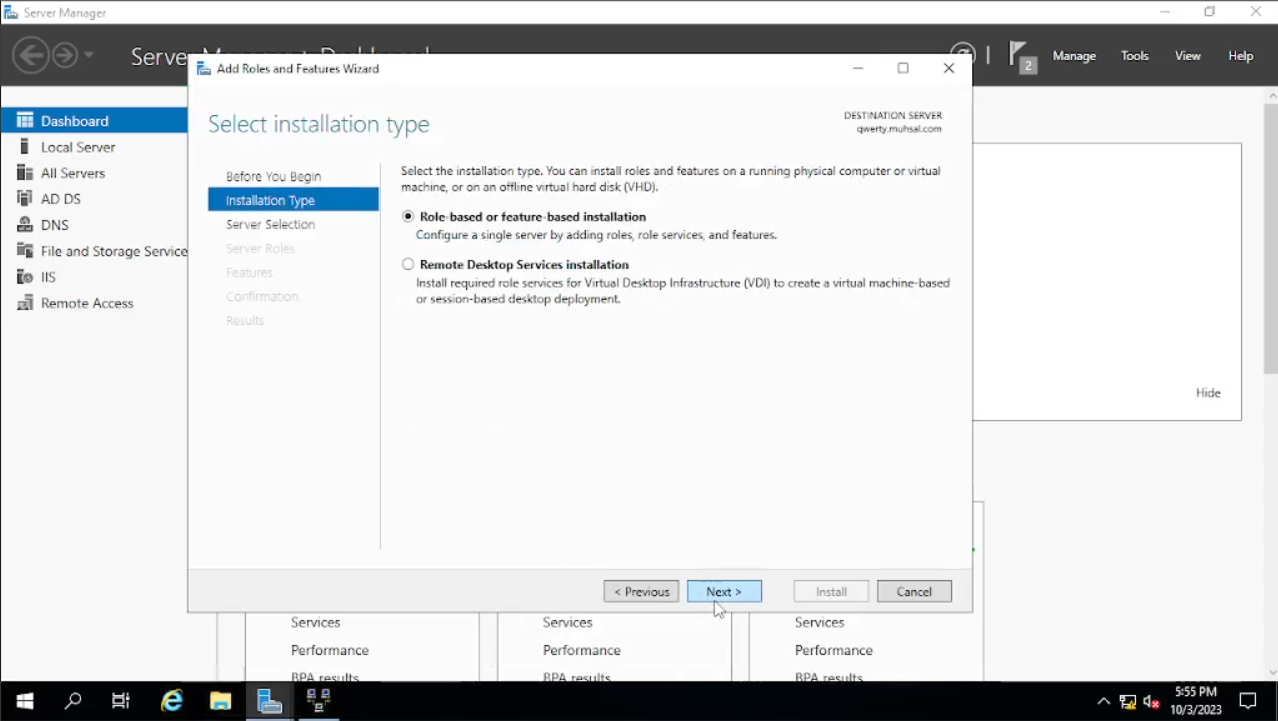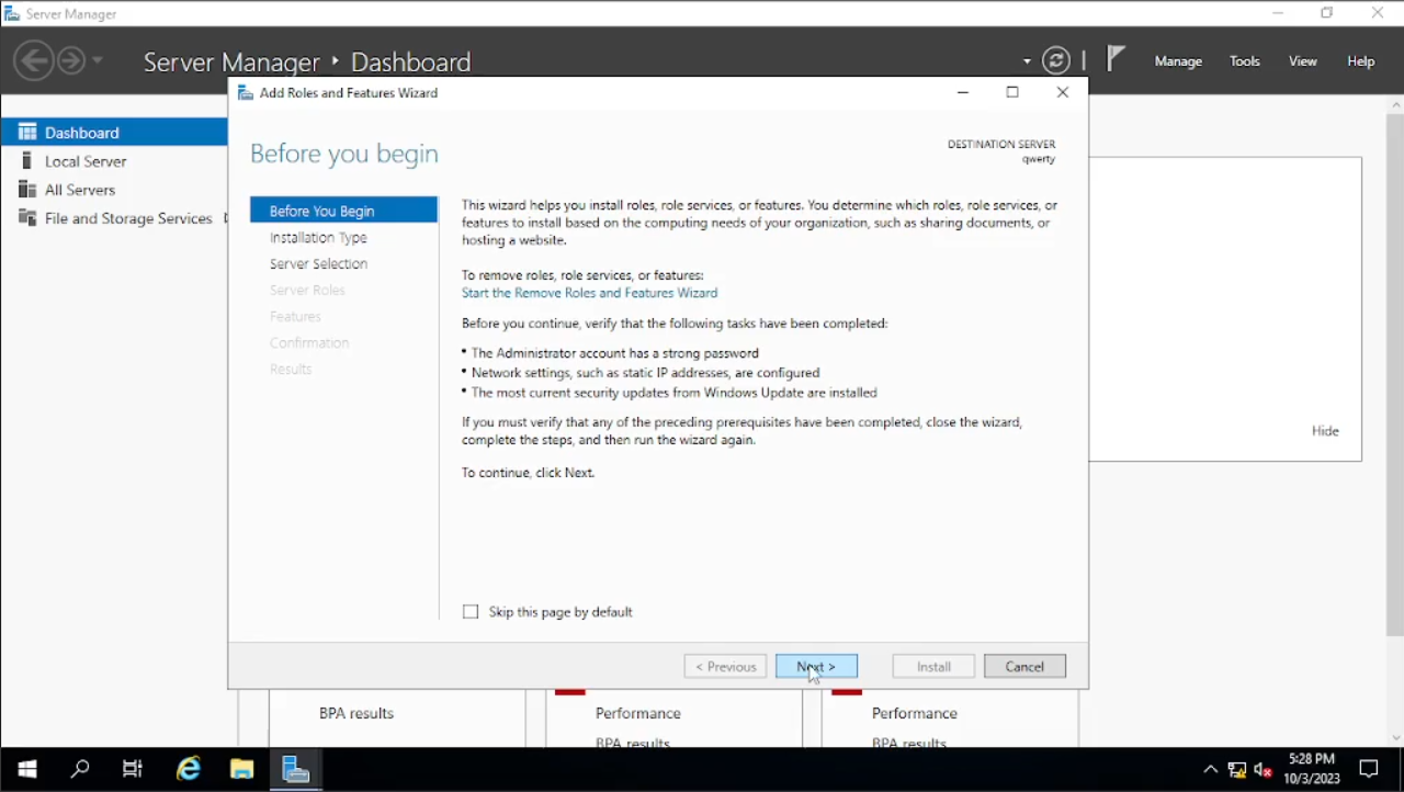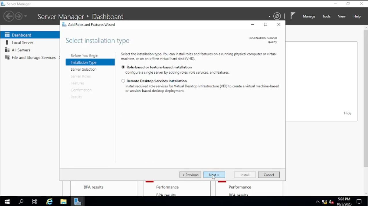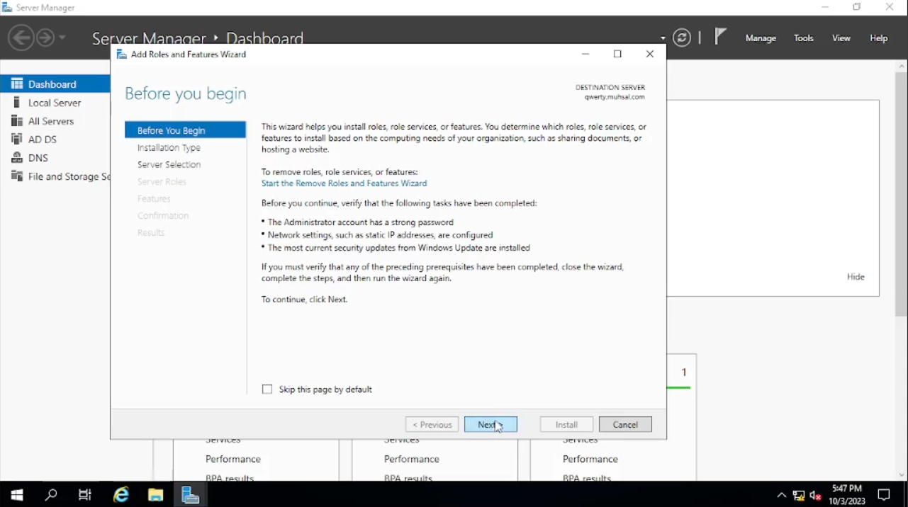 Maka akan muncul windows baru seperti di gambar pada bagian “Before You Begin” klik saja “Next”, pada bagian “Installation Type” default-nya akan “Role-Based” atau jika tidak pilih saja pada “Role-Based” lalu “Next. Pada bagian “Server Selection” bisa kalian lihat di tab “name” di bawah adalah “qwerty” atau nama PC yang sudah kalian ubah begitu juga dengan IP Address-nya klik “Next” saja.