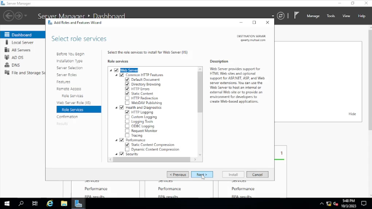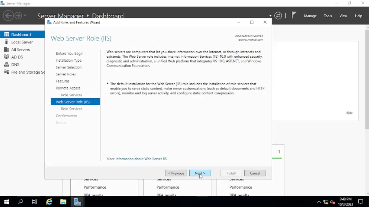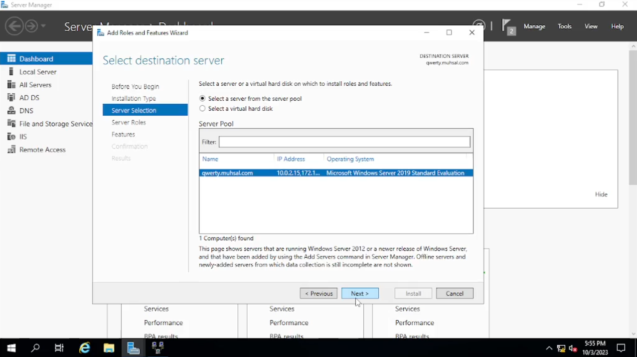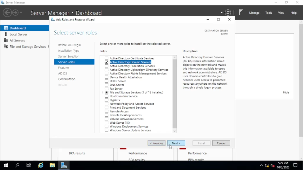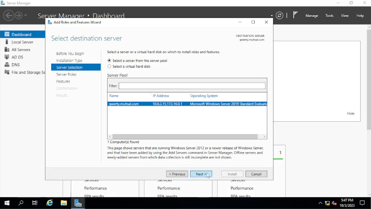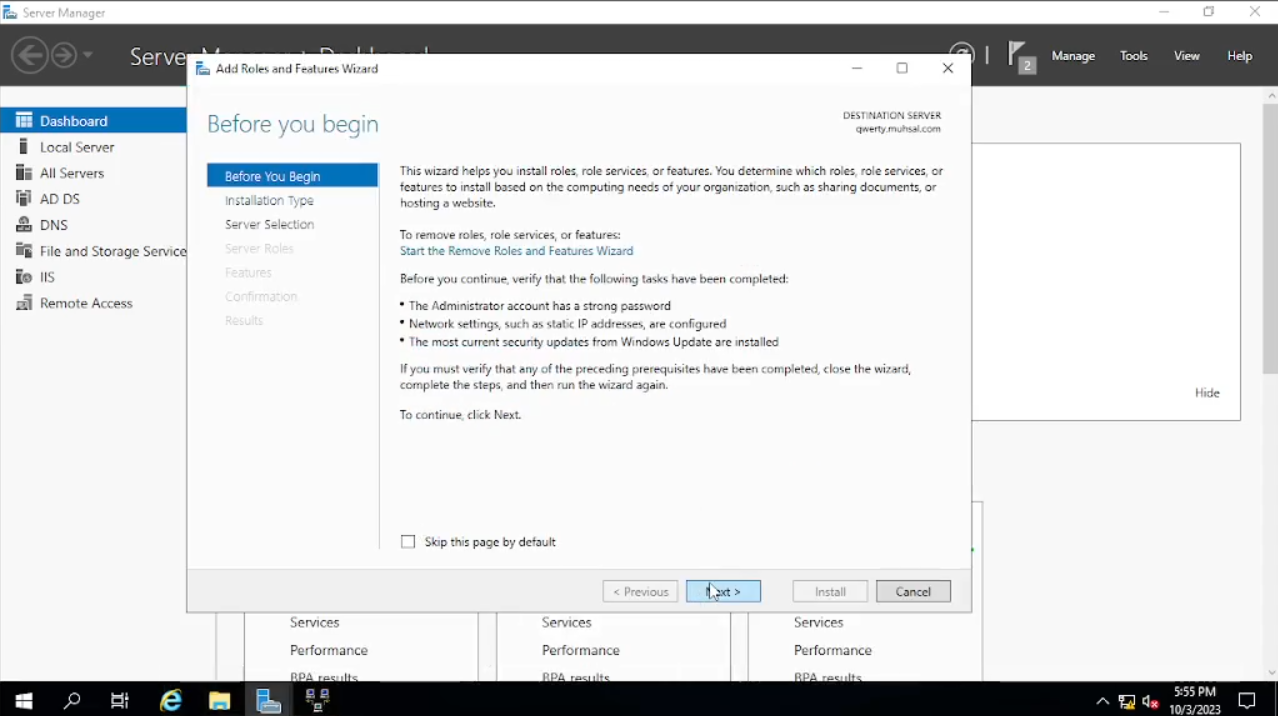 Maka akan muncul windows baru seperti di gambar pada bagian “Before You Begin” klik saja “Next”, pada bagian “Installation Type” default-nya akan “Role-Based” atau jika tidak pilih saja pada “Role-Based” lalu “Next. Pada bagian “Server Selection” bisa kalian lihat di tab “name” di bawah adalah “qwerty” atau nama PC yang sudah kalian ubah begitu juga dengan IP Address-nya klik “Next” saja.