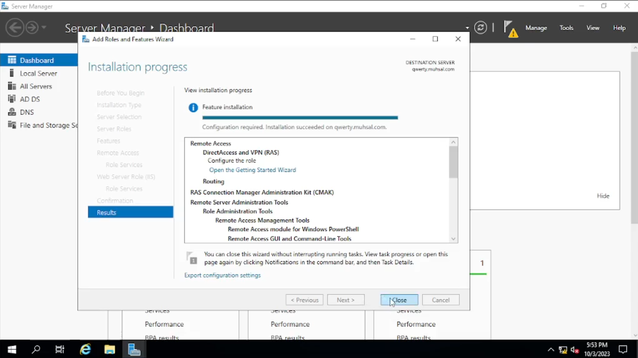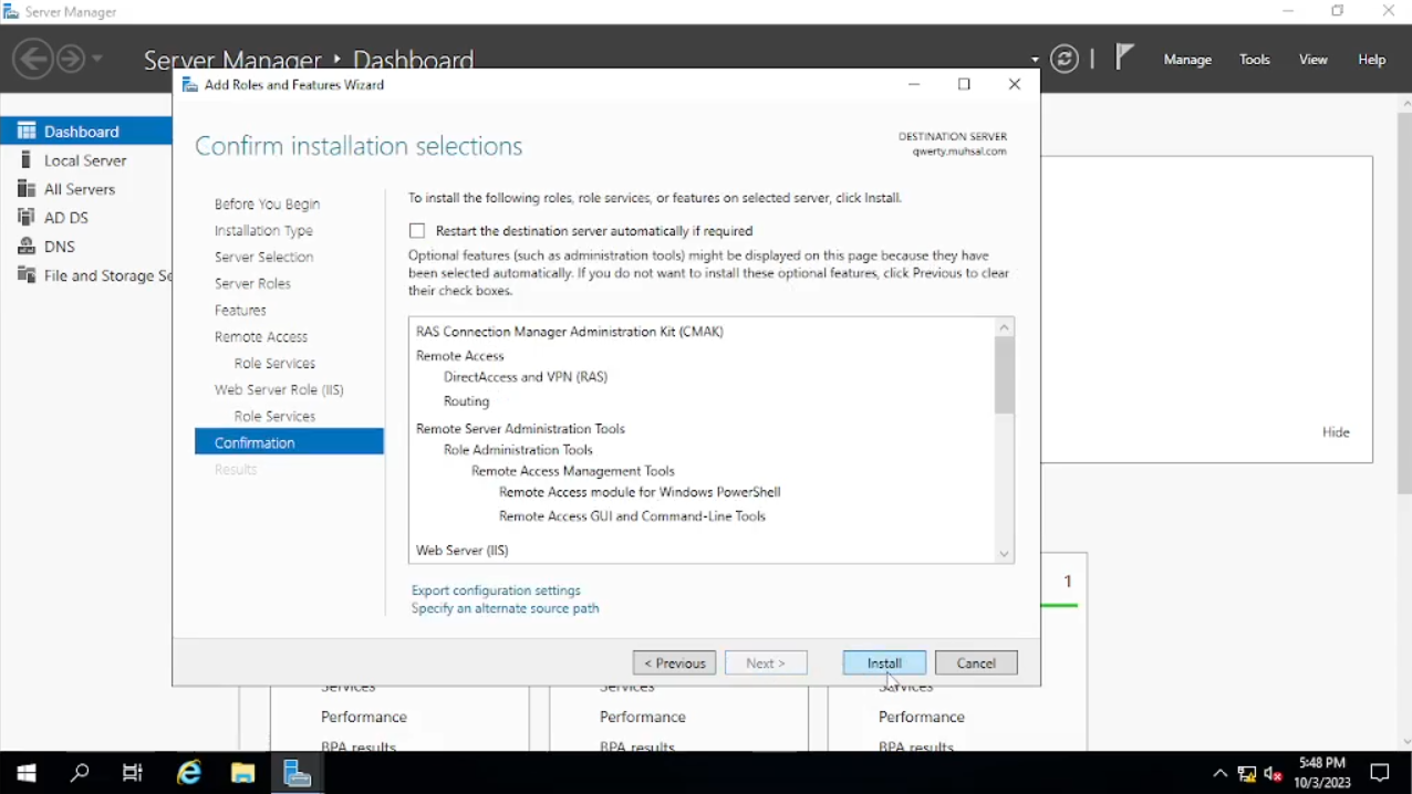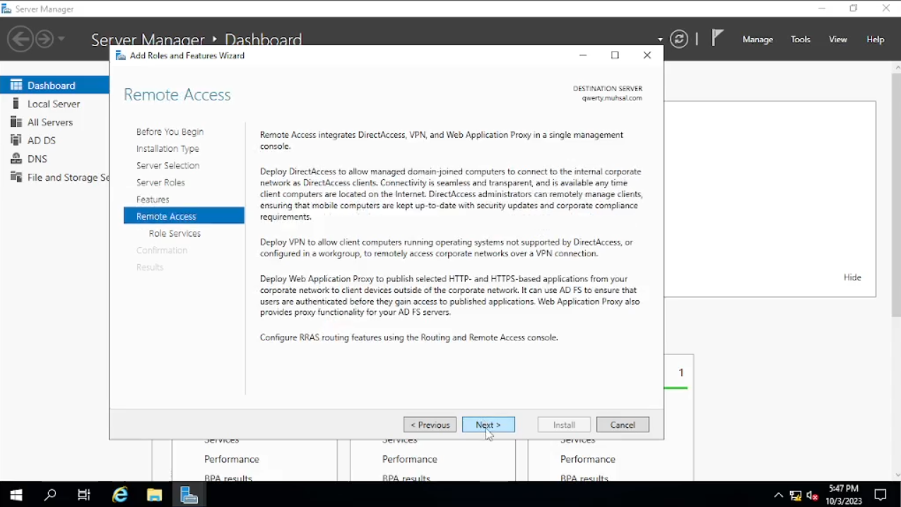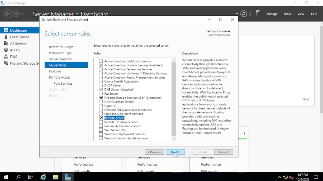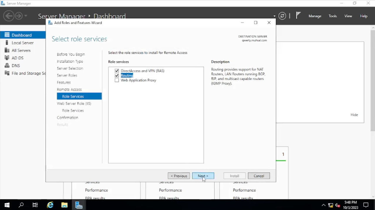 Buka “Server Manager” kalian, klik “Add roles and Futures” kemudian klik “next” sampai dengan tab “Server Selection”, bisa dilihat tab “name” yang berada di tengah kini berubah menjadi ada tambahan dari domain “qwerty.muhsal.com” kita “next” saja. Pada tab “Server Roles” kita check “Remote Access” dan “next” sampai pada tab “Role Services” setelah itu kita check pada “Routing” akan muncul windows baru klik saja “Add Features”. Bila sudah, pada check box “Direct Access and VPN (RAS)” tiba-tiba ter-check tidak apa biarkan saja kita “next” saja sampai kita klik “install”.