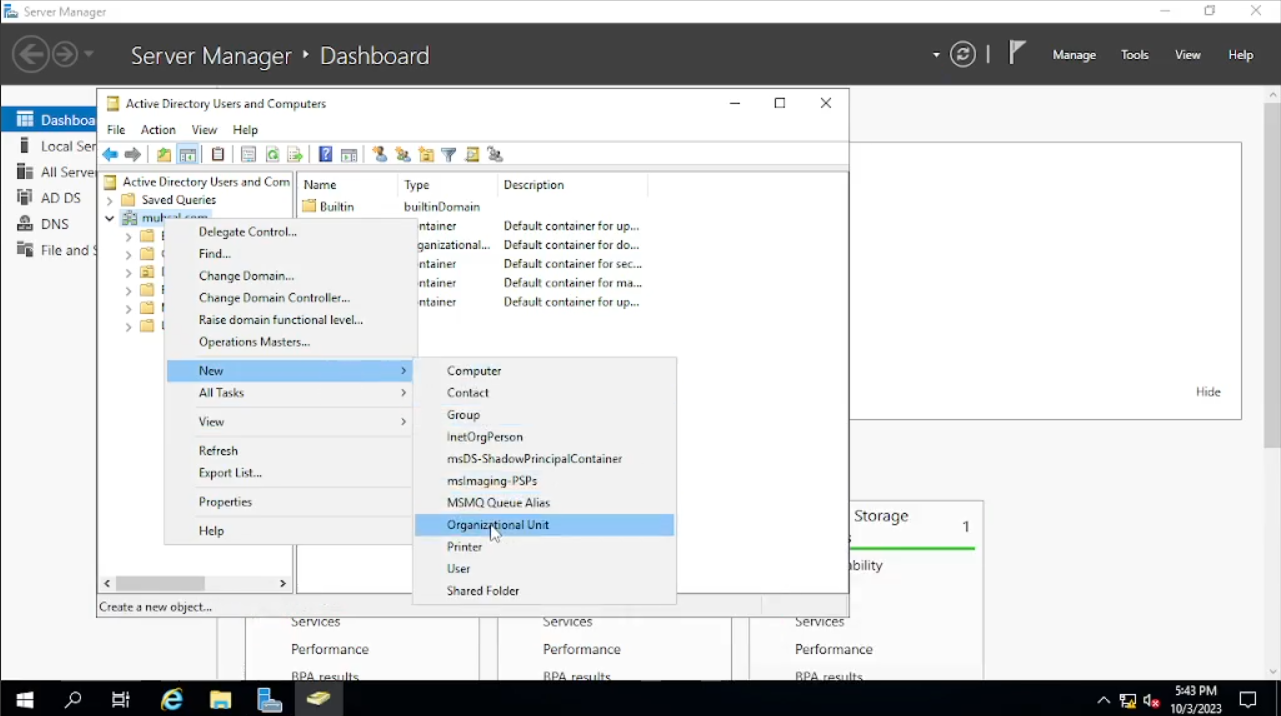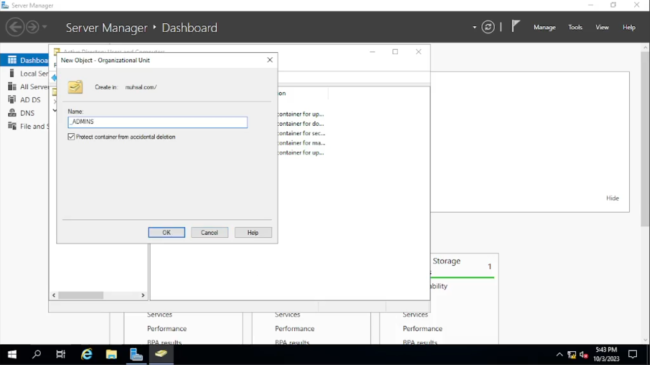Ketika muncul windows baru kita klik kanan pada “muhsal.com” pilih “New” dan “Organitational Unit”. Di sini kita akan membuat folder sesuai dengan jabatannya misal kita akan membuat folder di mana dikhusus kan untuk admin dan kita akan menamakan foldernya dengan “_Admins” pada checkbox di bawahnya bisa kalian uncheck tapi untuk keamanan semisal agar tidak sengaja terhapus bisa kalian check saja, tetapi kembali lagi kepada kebijakan perusahaan.