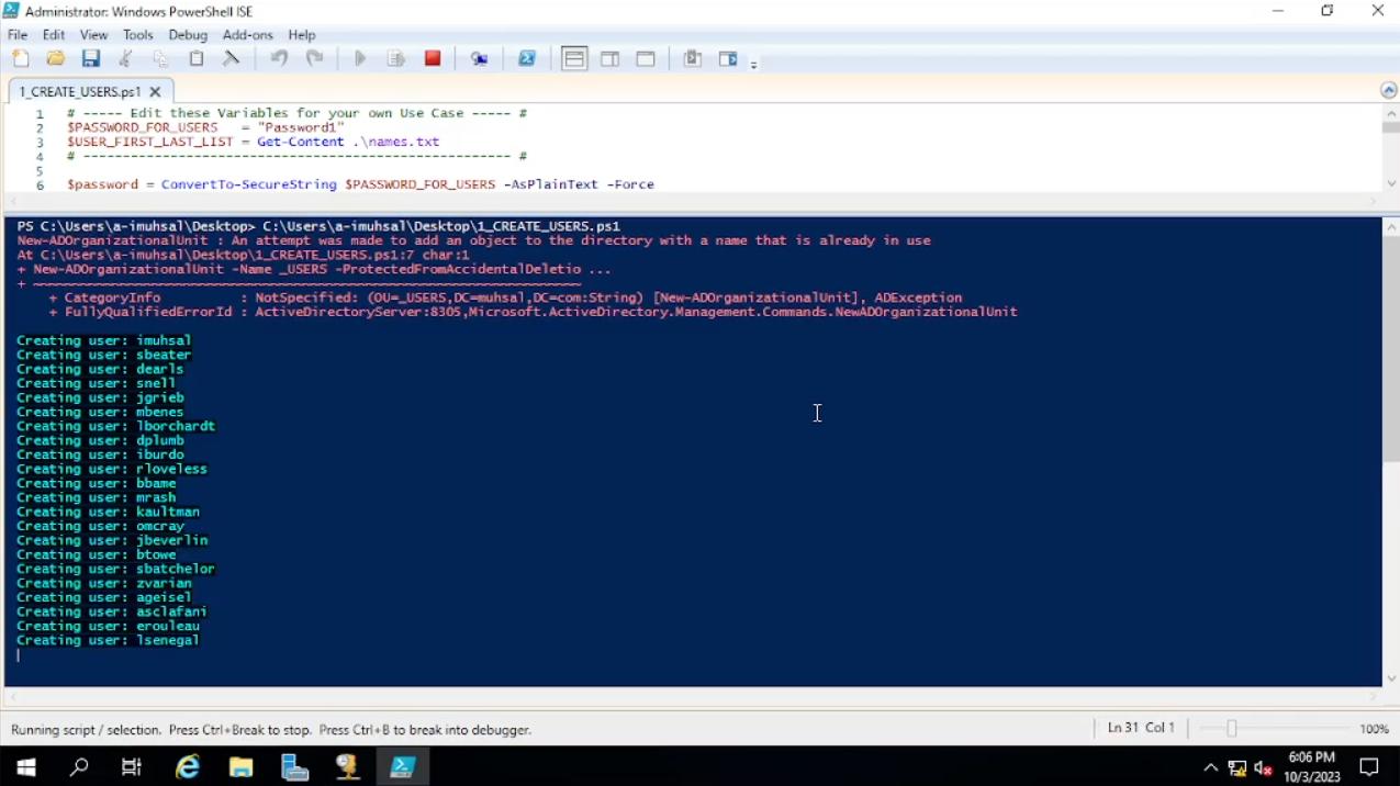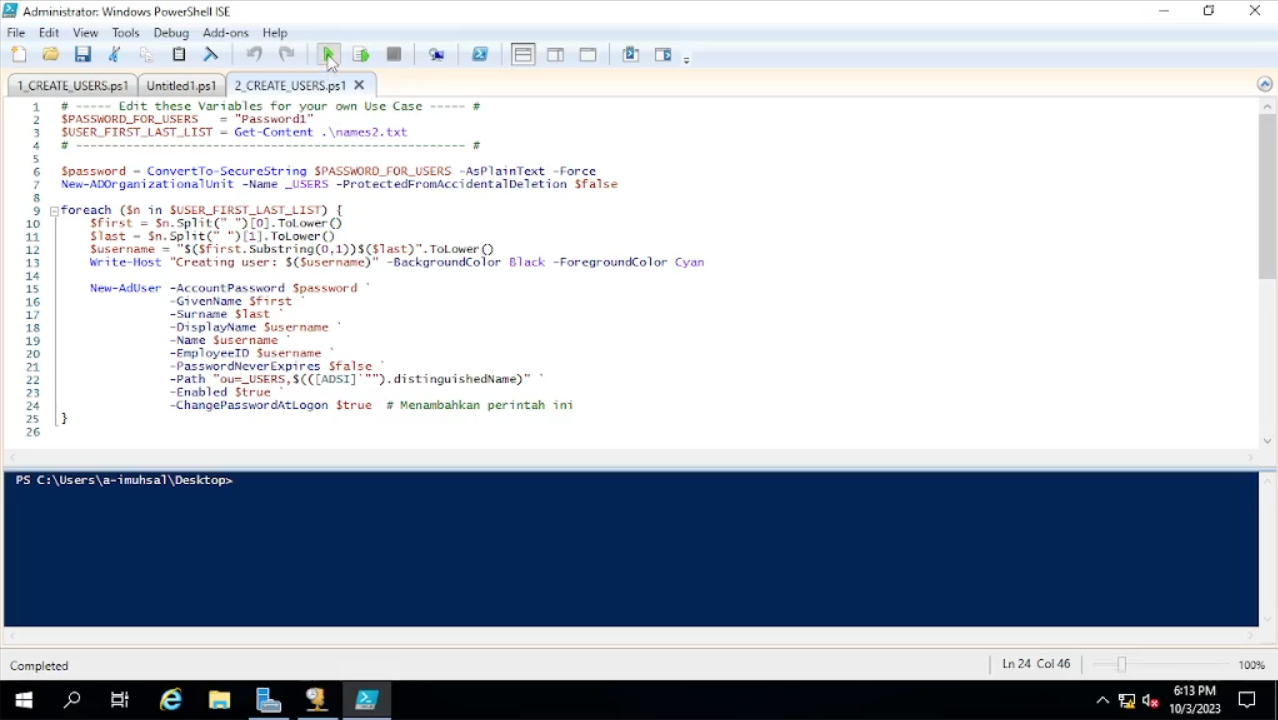 Cara menggunakannya sama saja seperti yang pertama, tetapi kita akan mengubah “names” dari “$USER_FIRST_LAST_LIST = Get-Content .\names.txt” dengan “names2”. Perbedaan dari script yang pertama dengan yang kedua ini kita mengubah “-PasswordNeverExpires $false” menjadi “false” dan menambahkan script ini di bawahnya “-ChangePasswordAtLogon $true”. Kalau bertanya kenapa tidak dihapus saja “-PasswordNeverExpires $false” dan langsung diganti dengan “-ChangePasswordAtLogon $true”? Entah kenapa ketika melakukan itu tidak berjalan dengan rencananya, jadi yasudah seperti ini saja. Mungkin bila ada masukkan bisa komentar di bawah. Karena Power Shell ISE-nya sudah di Desktop saya kira langsung “Run” saja.
