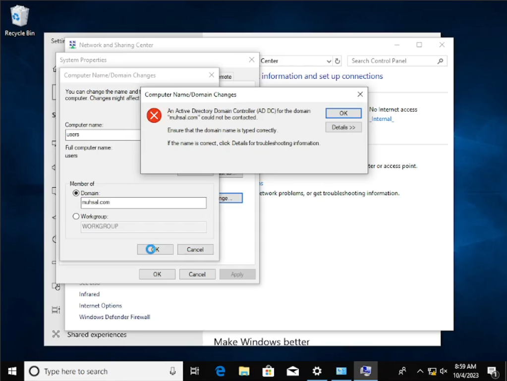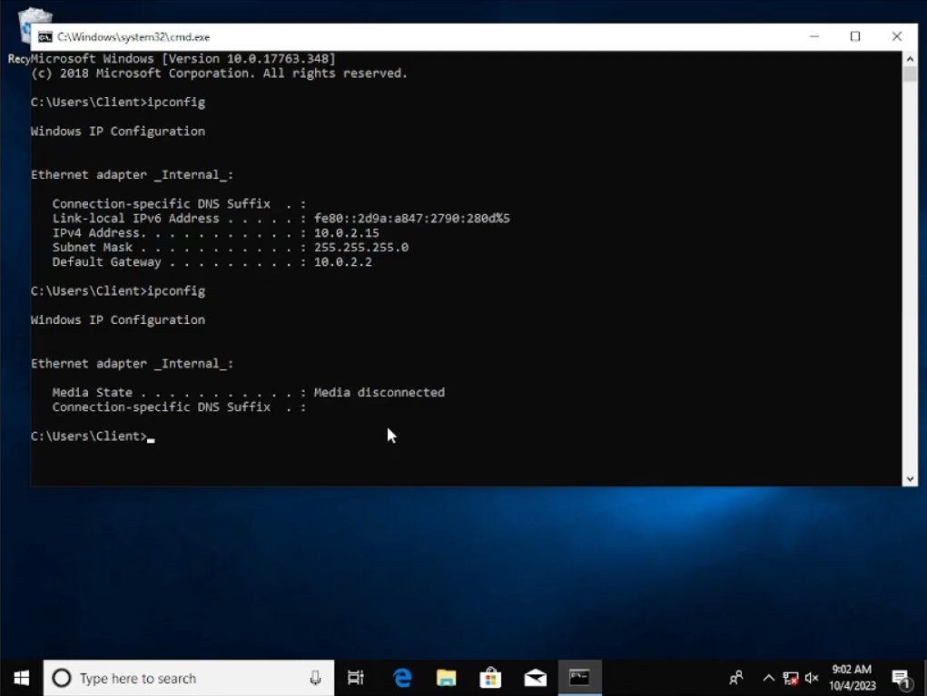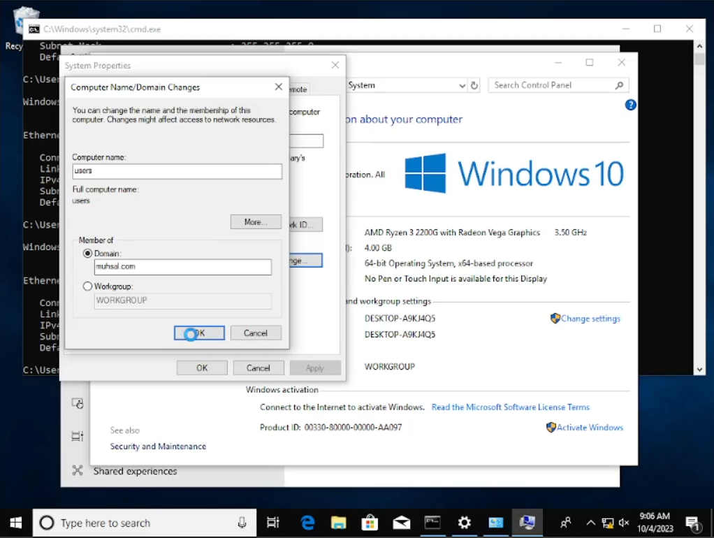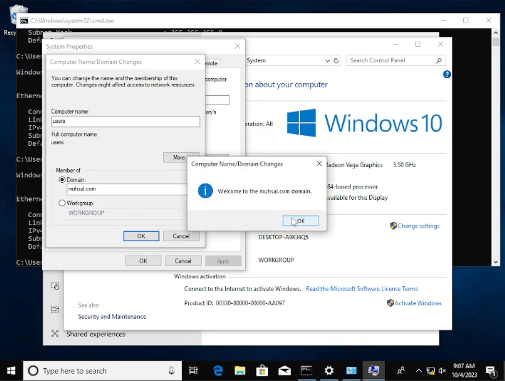 Setelah muncul windows baru yaitu “System Properties” klik pada tombol “Change” dan masukkan “Computer Name” menjadi Client dan juga domain menjadi “muhsal.com”. Bila sudah, selamat anda sudah terkoneksi ke dalam server. Sedangkan di sini saya ada kendala yang di mana ketika saya mencoba melihat IP saya menggunakan “cmd” ternyata merupakan IP koneksi sendiri atau menggunakan “NAT” yang seharusnya menggunakan “internal network”, sehingga kita harus ubah dulu pada settingan vbox-nya.