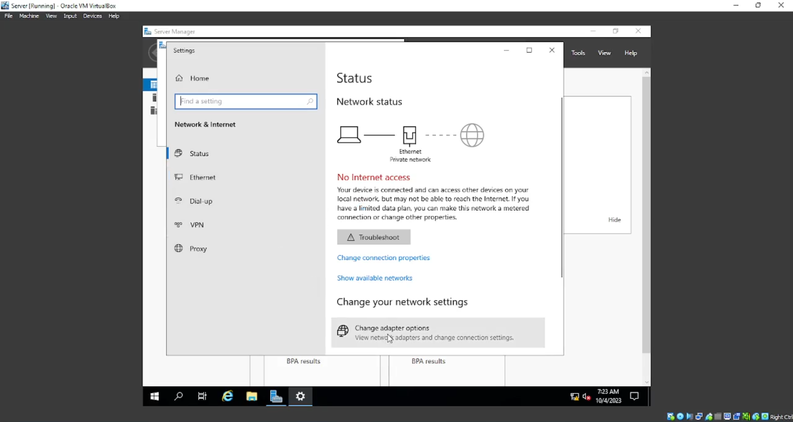 Bila sudah “Server Manager” akan terbuka dengan sendirinya, begitu juga dengan “Networks” pilih saja “Yes” itu hanya akan tampil sekali saja. Kali ini kita akan mengkonfigurasi “Networks” pertama kita klik kanan pada icon computer yang ada di kanan bawah dan pilih “Open Network & Internet Settings” maka akan muncul windows “Settings” lalu klik pada “Change adapter options” dan akan muncul lagi windows bernama “Network Connections”.