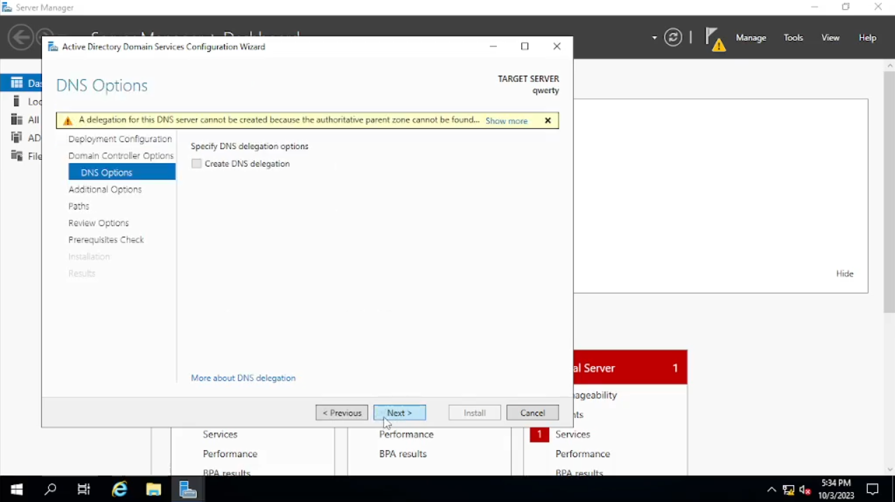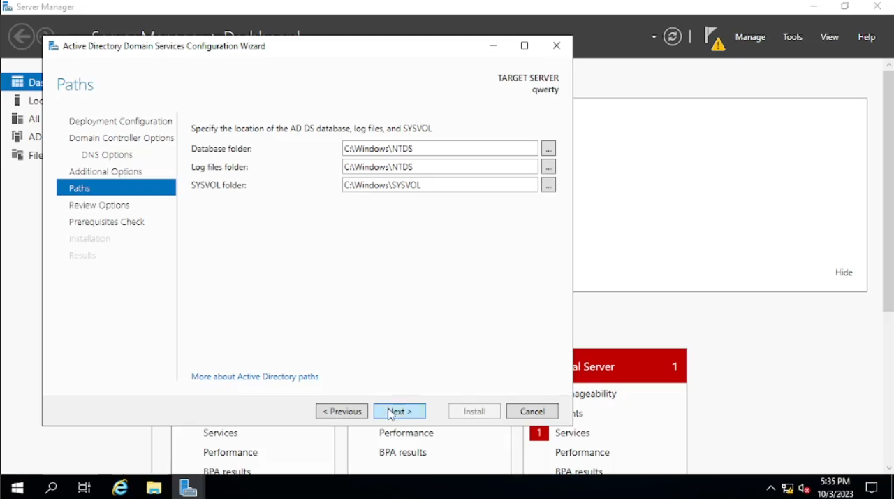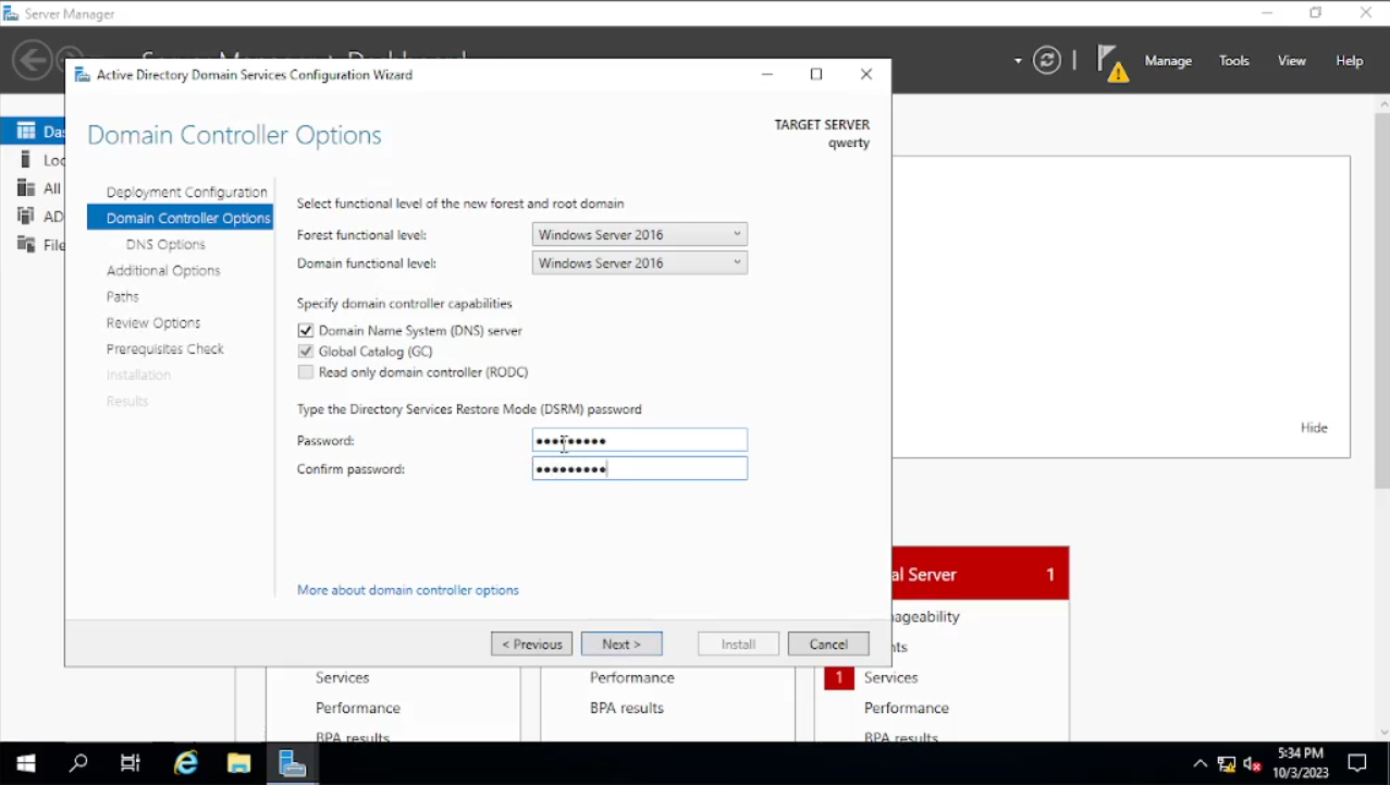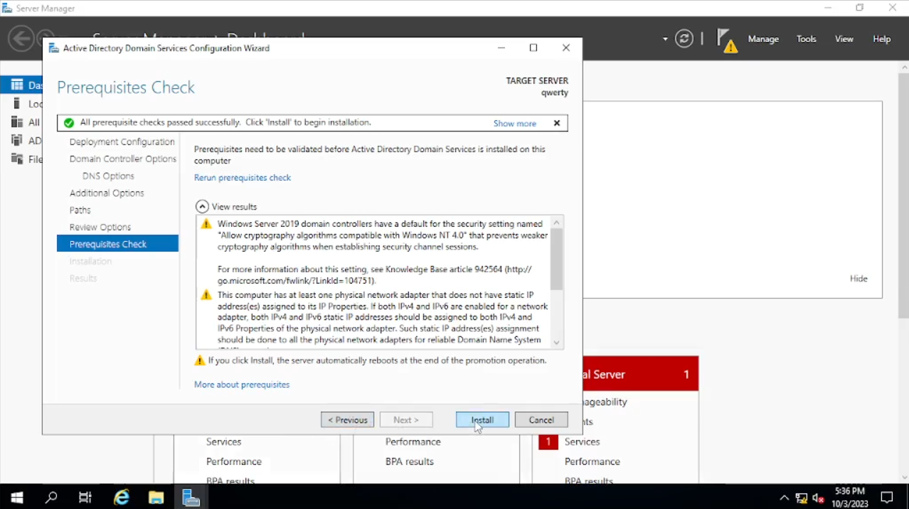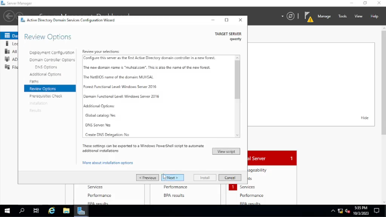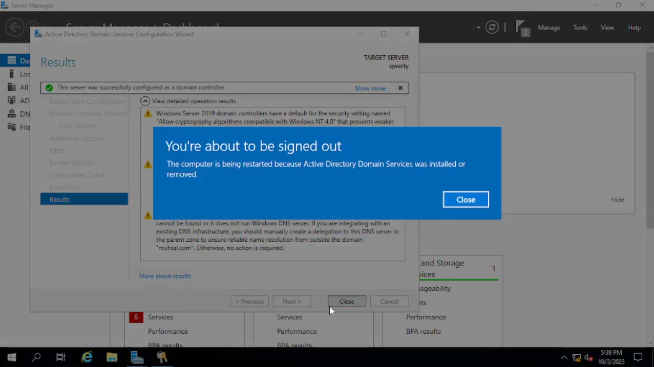 Di sini kita akan menginstal dan menamai domain kita, lalu memberikan Password. Pada bagian tab “Deployment Configuration” akan ada beberapa pilihan di sini kita akan pilih “add a new forest” dan menamai “Root domain name”, saya menamainya dengan muhsal.com. lalu klik “Next”. Pada bagian tab “Domain Controller Options”, di sini kita akan menambahkan password setelah itu klik “Next” sampai pada bagian tab “Prerequisites Check” klik “install”. Bila sudah selesai klik “Close” dan kita akan disuruh untuk “Sign Out” dan akan merestart secara otomatis.
