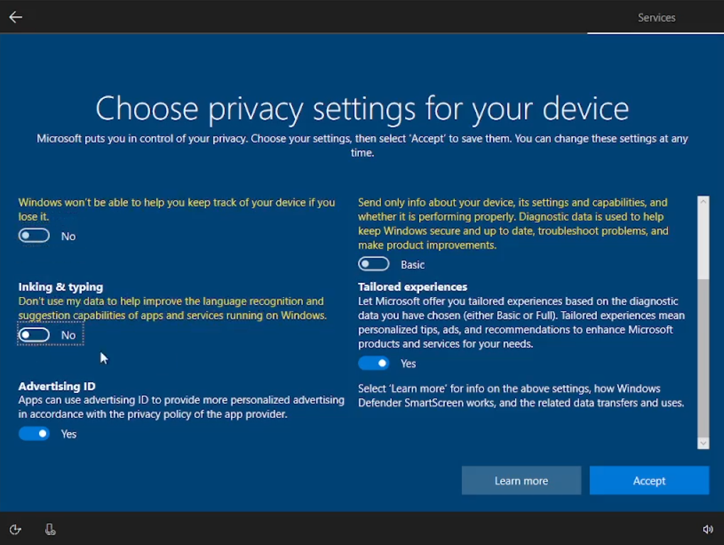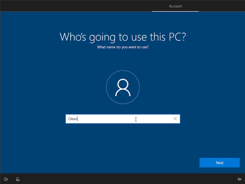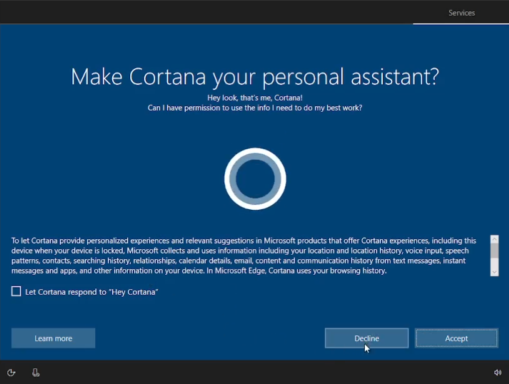 Sesampainya kalian sudah sampai sini kita akan menamakan PC kita menjadi “Client” atau “User” juga boleh. Untuk Password kita kosongkan saja lalu klik “next”, Cortana kita “Decline”, turn off semua privacy settings dan “accept”