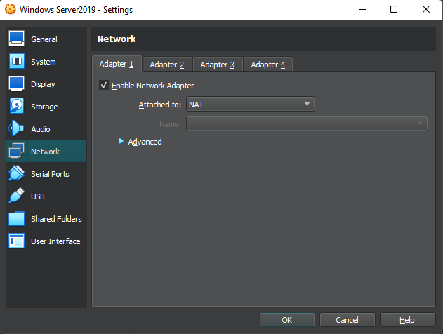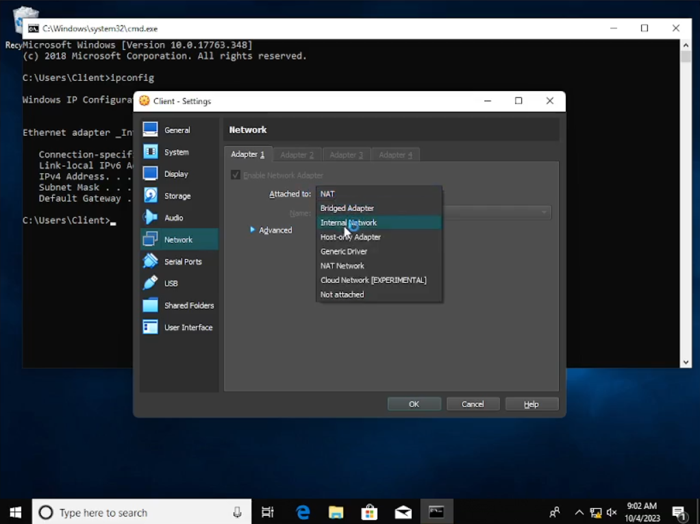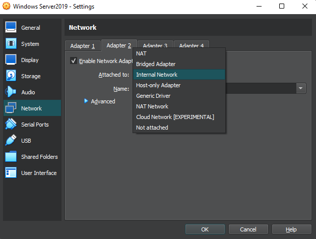 Nah kali ini kita lakukan hal yang sama ke client atau windows 10, yang membedakannya di sini yaitu pada tab “Network” di samping. Pada client ini kita hanya meng-enable pada “Adapter 1” saja, lalu ubah “Attached to” ke “Internal Network” dan untuk “name” tolong disamakan dengan yang ada di windows server yaitu “intnet” sehingga “Client” akan terhubung ke Windows Server seperti LAN dan juga dapat terkoneksi internet dari server, bukan mengambil koneksi internet dari komputer kita. Setelah itu klik OK.
