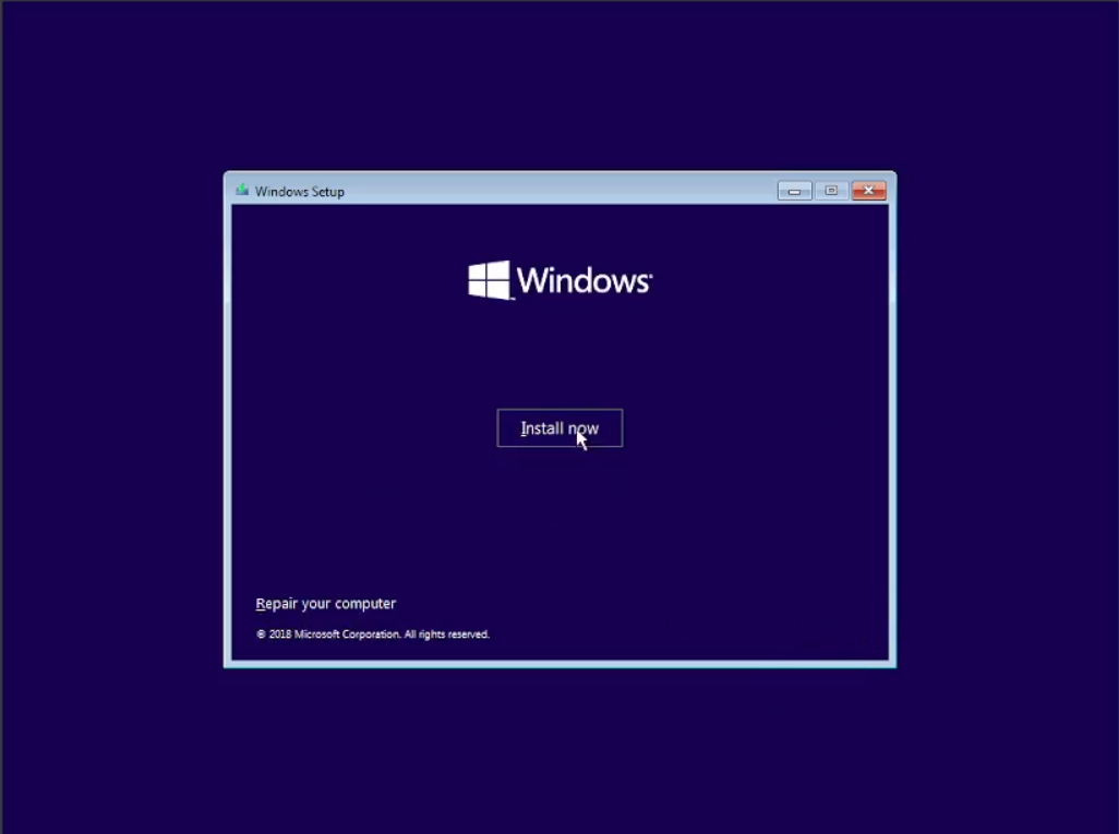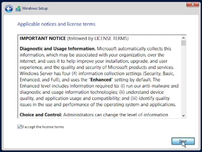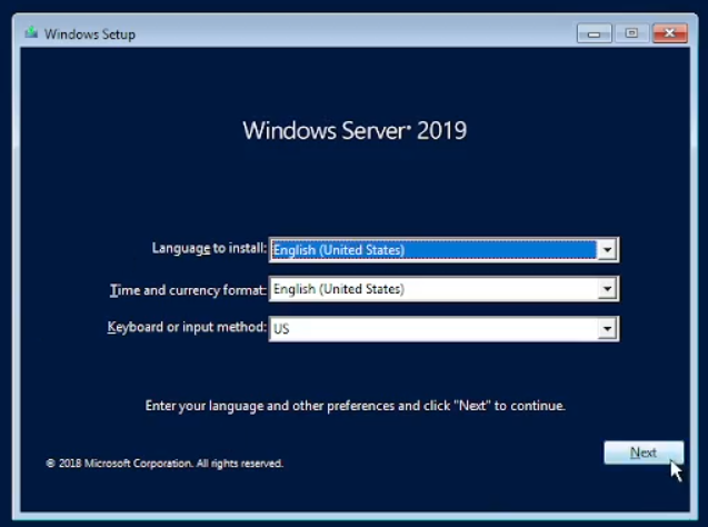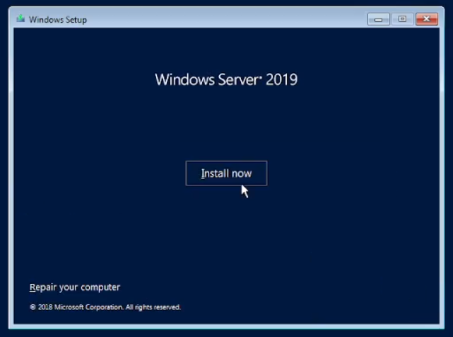 Sekarang kita akan memulai menginstal Windows Server, pilih windows server lalu kilk start. kita tunggu sampai seperti yang ada pada gambar di bawah. Langsung saja next dan klik install now. Tunggu beberapa saat lagi akan ada 4 pilihan untuk memilih jenis Windows Server apa yang akan kita gunakan. Di sini kita akan menggunakan pilihan yang ke 2 yaitu “Windows Server 2019 Standard Evaluation (Desktop Experience)”. Lalu klik next.