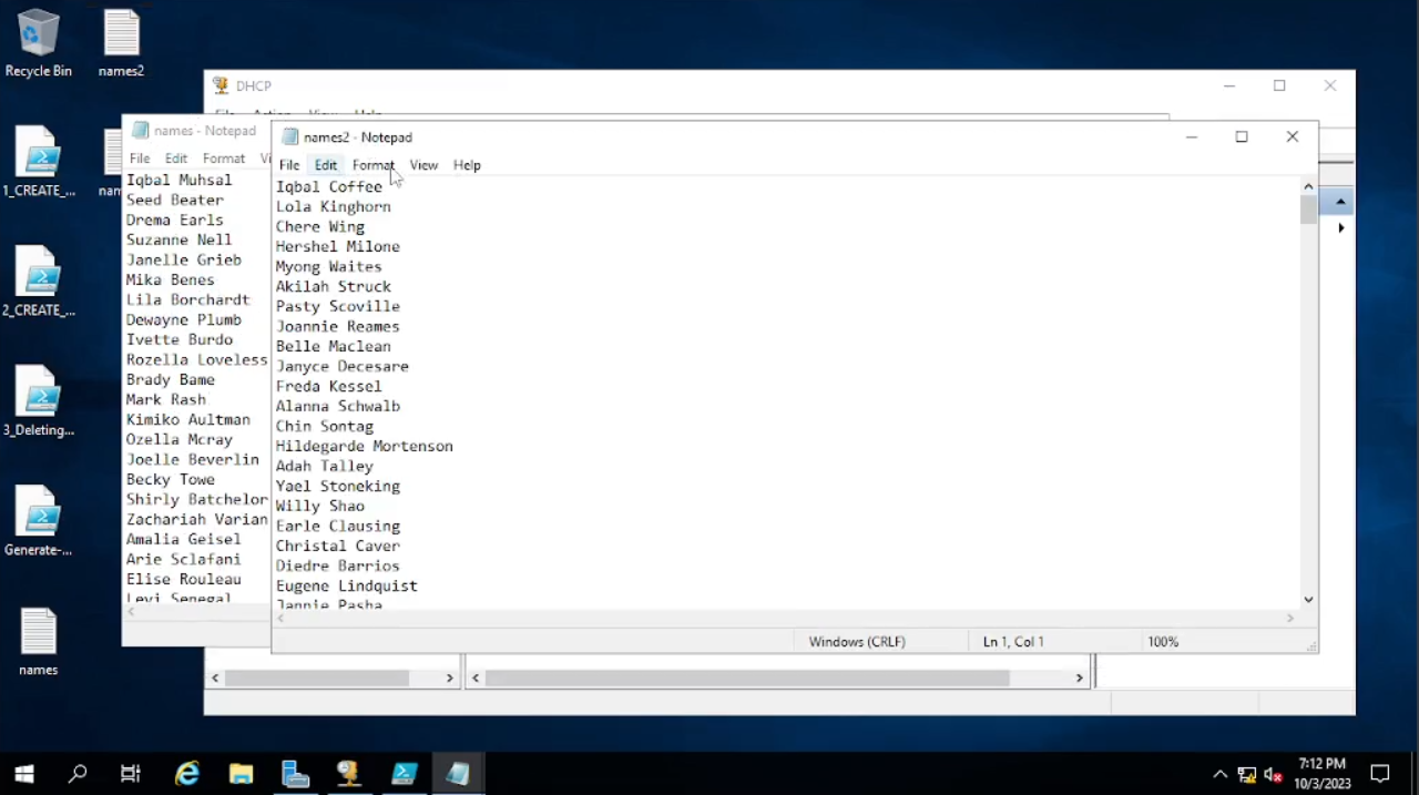 Skenario yang akan kita buat adalah kita akan menggunakan script “1_Create Users” pada “names”, sedangkan pada script “2_Create Users” digunakan pada “names2”. Untuk file “names3” bisa kalian buat nama sendiri bebas dan coba untuk dibuatkan. Setelah kita selesai dan mengecek apakah sesuai dengan script yang kita buat, kita akan coba menggunakan script “3_Deleting_Users” untuk mencoba menghapus beberapa users yang sudah ada, misal nanti kita akan menggunakan list pada “names” atau pun “names2”.