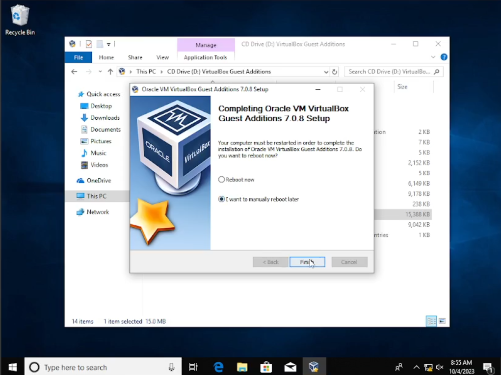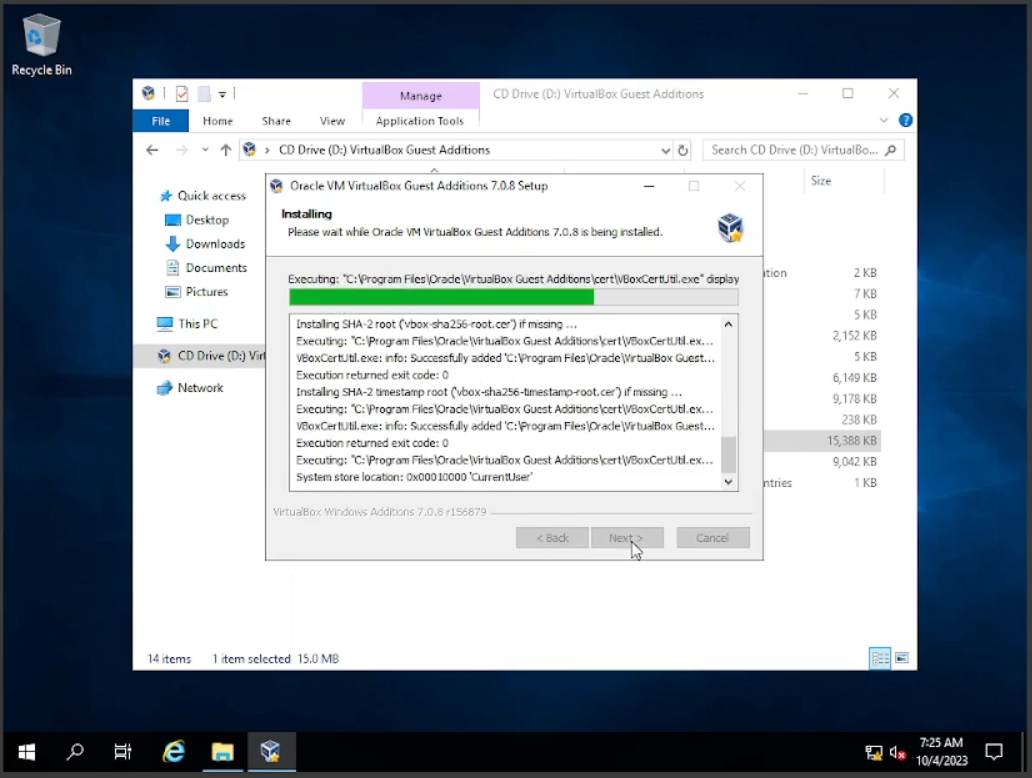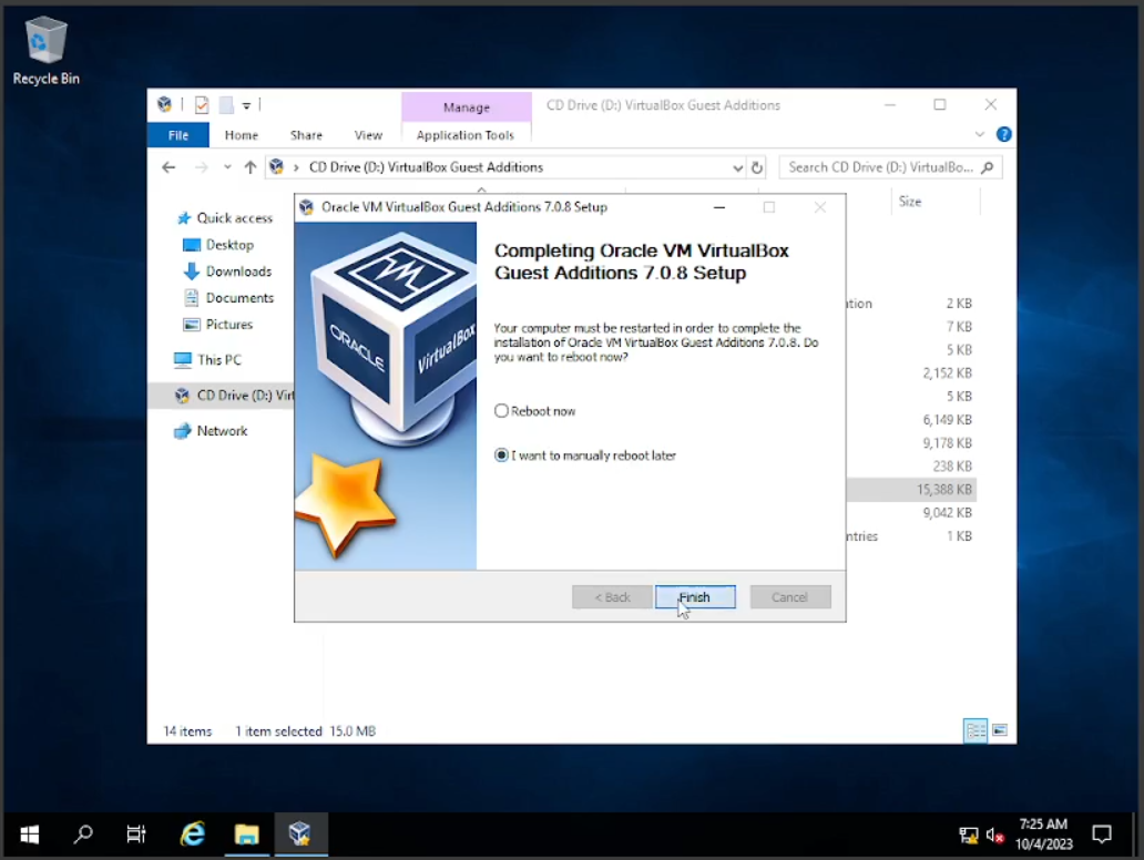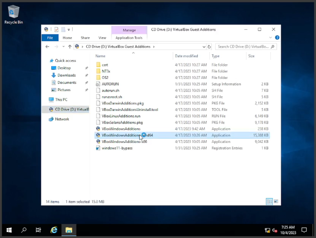 Setelah selesai dengan koneksi, kita akan menginstal “Guest Additions” ini fungsinya sangat banyak bisa kalian googling yang jelas, fitur yang akan dipakai di sini agar kita bisa “drag n drop” atau pun “copy paste” antar virtual windows dengan actual windows. Klik tab “Devices” di atas VBox, lalu klik pada “Insert Guest Addtions CD Image”. Setelah itu kita buka “folder” klik pada “CD Drive” dan cari file “VBoxWindowsAdditions-Amd64” lalu klik 2x install software seperti biasanya.