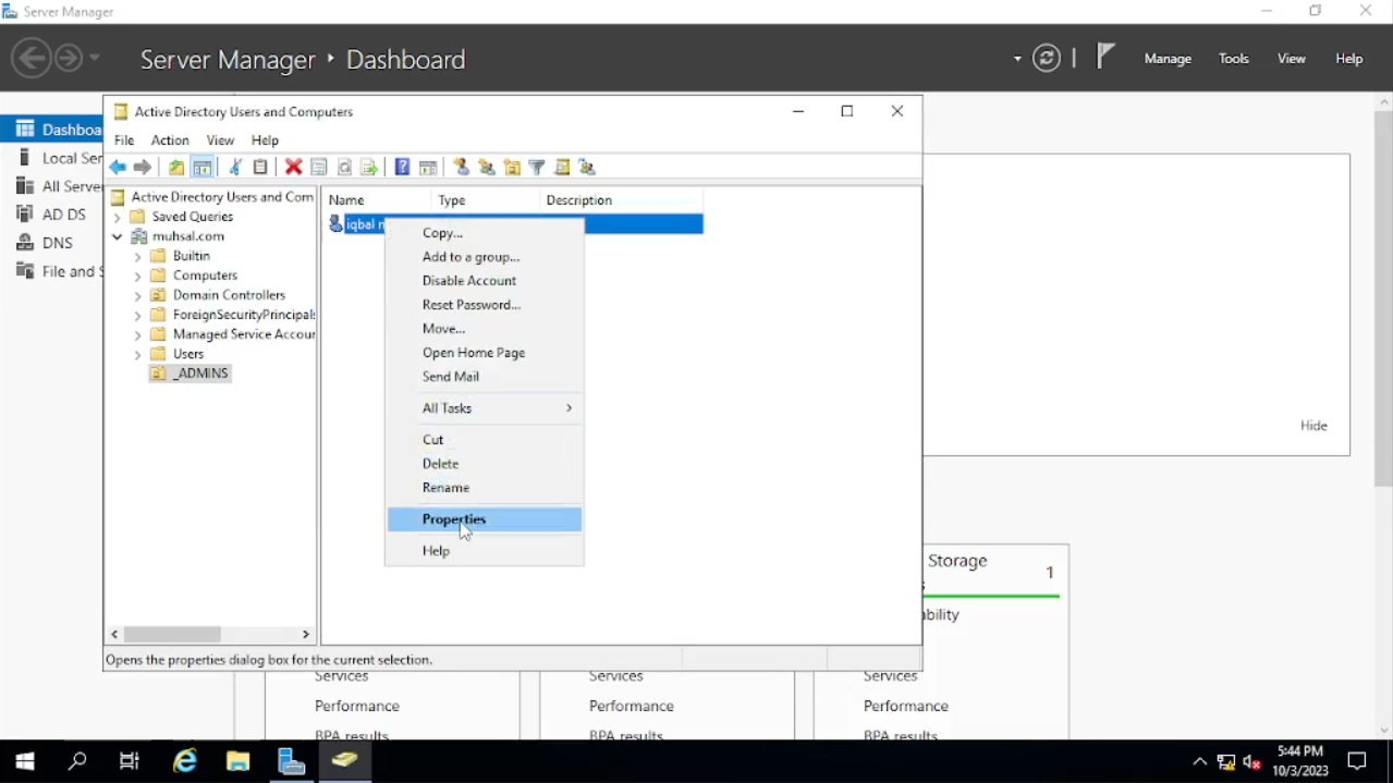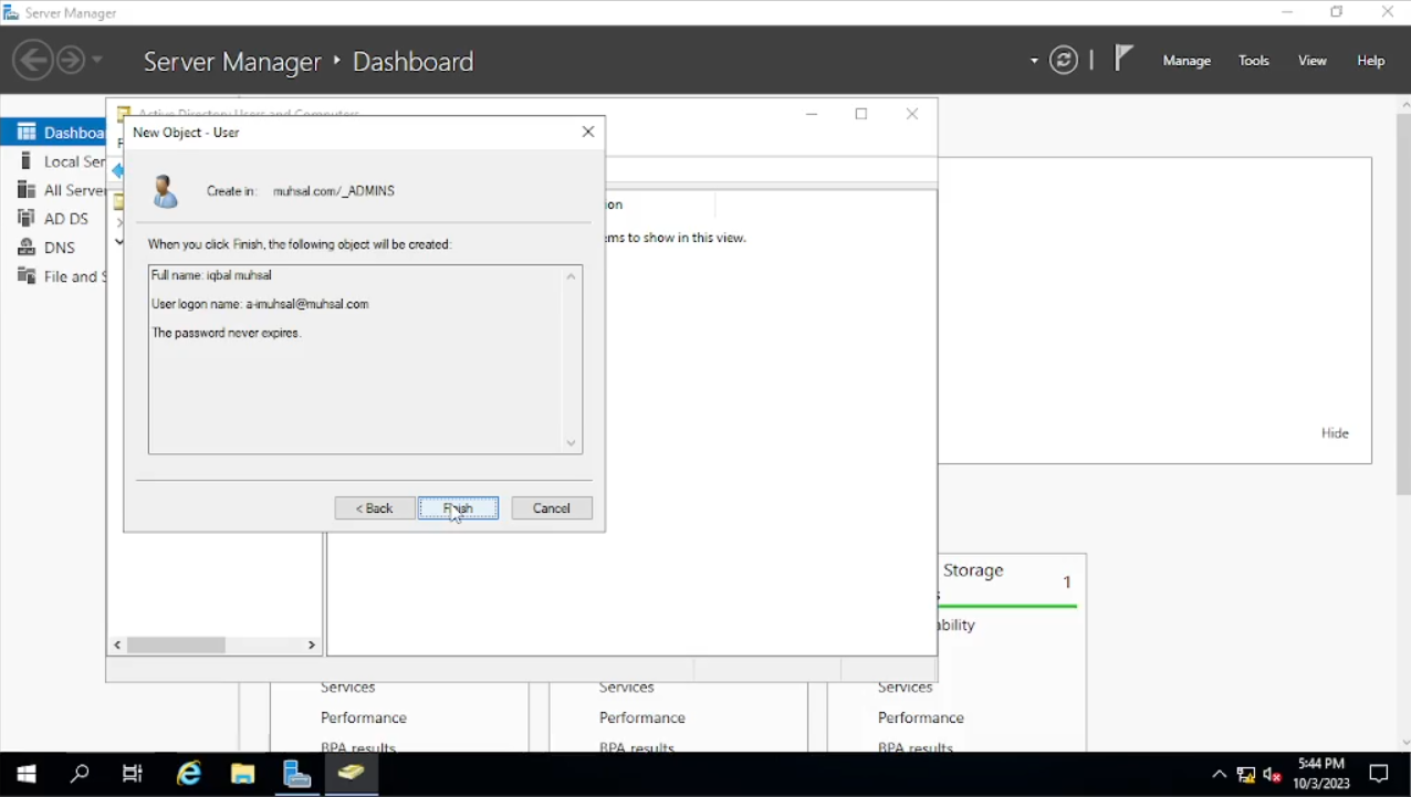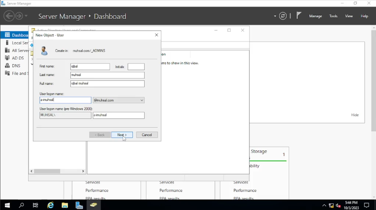 Selesai membuat folder “_Admins” kita akan memasukan user admin, klik pada folder “_Admins” lalu klik kanan pada kotak kosong yang besar itu atau kalian juga bisa klik kanan langsung pada folder “_Admins” pilih “New” dan “User”. Lalu kita akan masukan sesuai dengan identitas si user, untuk “Initials” kita kosongkan saja. Sedangkan untuk kotak pada “User Logon Name” saya memadukan antara First name dengan Second name. Untuk first name saya mengambil huruf depannya saja misal Iqbal, kita ambil huruf pertamanya yaitu “i” dan untuk second name kita ambil utuh. Jadi user name-nya menjadi “imuhsal”. Karena imuhsal ini admin, saya akan menambahkan “a-” yang berarti admin sehingga “User Logon Name” berupa “a-imuhsal” lalu “Next”