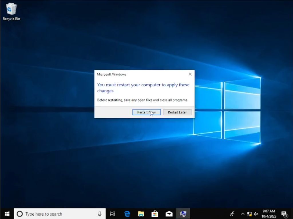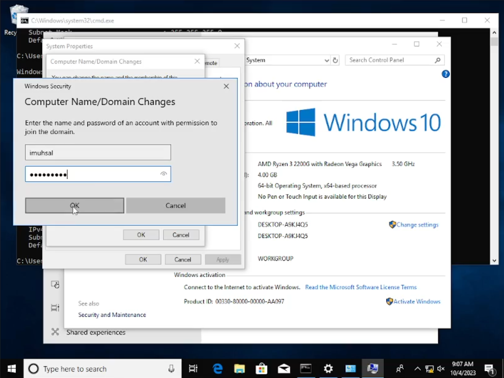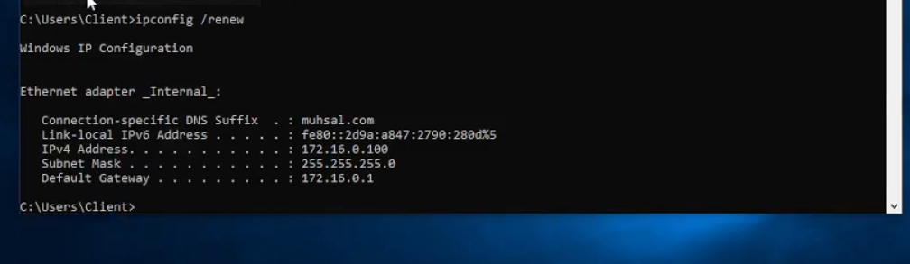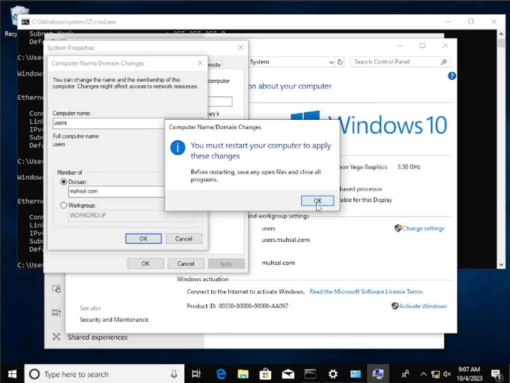 Jika sudah kita coba cek lagi IP address-nya dan sepertinya sudah sama “172.16.0.100” dan default gateway-nya “172.16.0.1” sama seperti di windows server. Coba masukkan lagi “Computer name” dan “Domain”, bila berhasil kalian akan memasukan nama user beserta dengan password-nya. Setelah itu klik “ok” maka komputer kalian akan merestart dengan sendirinya dengan mengklik “restart now”. Jadi bila sudah menginstal windows 10 lebih baik kita lihat dulu IP sebelum mengubah nama system, apakah sesudah sesuai atau belum seperti yang saya alami.