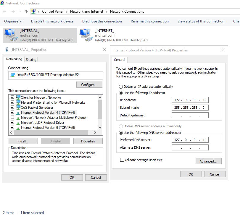 Selesai dengan mencari koneksi internet atau internal, kita sekarang akan mengubah IP Address, Subnet mask dan juga DNS pada koneksi “internal”. Mari kita klik 2x pada koneksi “internal” atau bisa klik kanan lalu pilih “Properties”, lalu klik 2x pada “Internet Protocol Version 4”. Kita klik pada pilihan “Use the following IP Address” dan isikan IP Address dengan 172.16.0.1 Subnet Mask 255.255.255.0 Default Gateway kita kosongkan. Pindah ke DNS ubah dengan 127.0.0.1 atau bisa dengan 172.16.0.1. Untuk Alternate DNS kita kosong kan saja, bila sudah selesai klik OK.