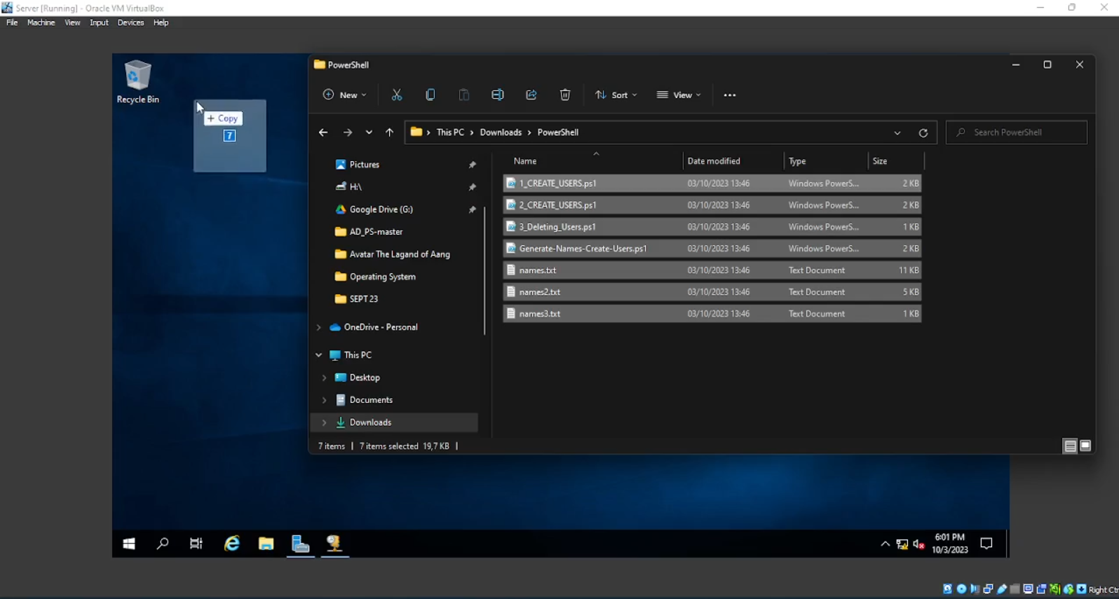 Kali ini kita akan mencoba membuat users menggunakan Script Power Shell. File tersebut bisa kalian download dan extract. Setelah itu kalian bisa drag file tersebut ke dalam virtual box. Di dalam file tersebut ada 7 file, 3 file merupakan script power shell, 2 file untuk membuat users baru sedangkan 1 file lain untuk menghapus users yang tidak digunakan. 4 file lainnya merupakan script Generate name dan list nama yang akan dibuat.