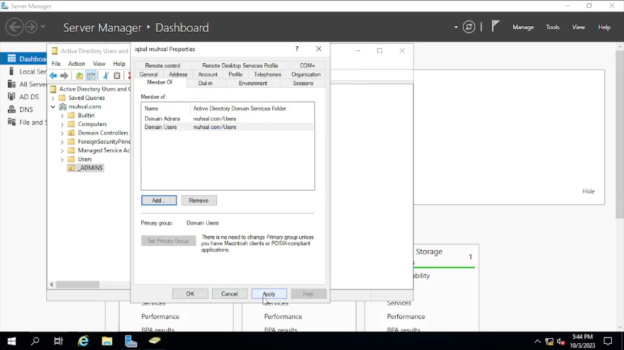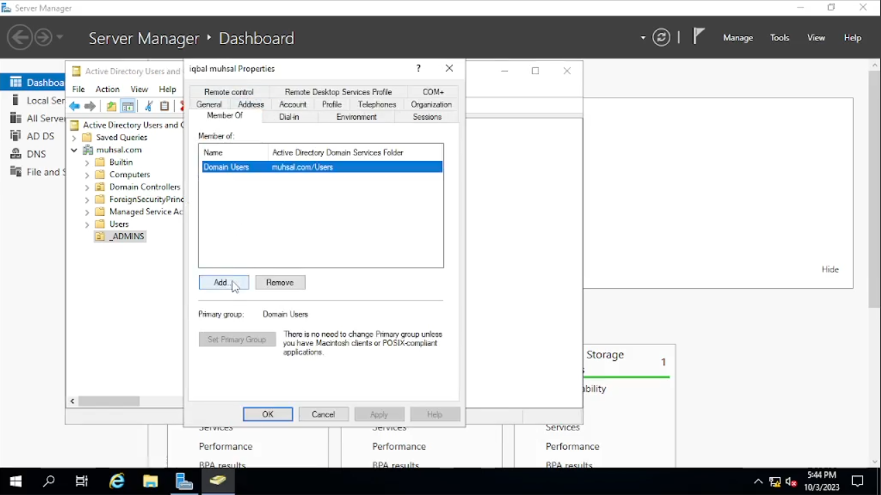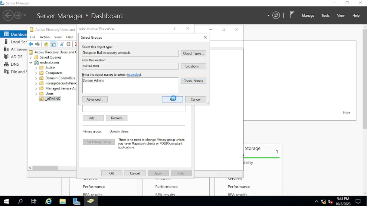 Selesai membuat user admin, user admin tersebut belum seutuhnya menjadi admin. Jadi di sini kita akan konfigurasi user tersebut masuk ke dalam domain admins dengan cara, klik kanan pada user yang sudah kita buat lalu klik “Properties”, kemudian kita cara tab “Member of”, klik tombol “Add” yang berada di bawah, kita tulis di kotak kosong tersebut dengan “Domain Admins”, klik tombol “Check Name” kemudia klik “OK”. Sekarang user tersebut sudah menjadi admin seutuhnya. Kali ini kita akan pindah menggunakan user admin, jadi kita akan logout, login menggunakan user admin tersebut serta juga kita akan menginstal RAS (remote access).