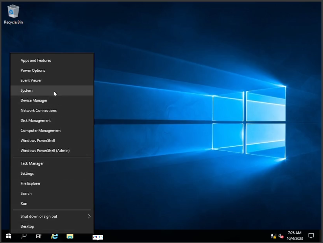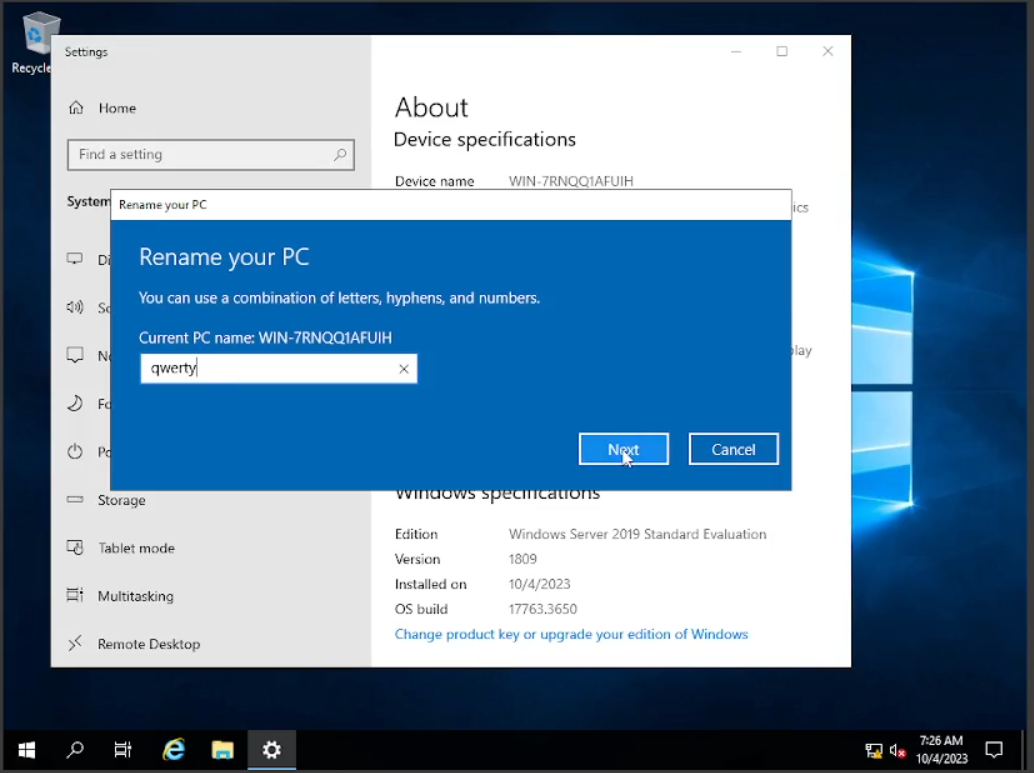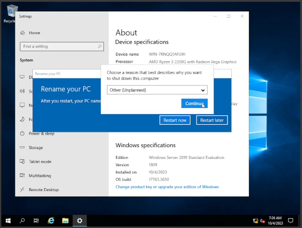Setelah selesai akan ada pilihan apakah kita akan memilih “Reboot” atau nanti saja, di sini saya pilih nanti saja karena kita akan mengubah nama PC ini terlebih dahulu dan setelah itu kita akan me-restart. Dengan cara klik kanan pada icon Windows di sebelah kiri bawah, setelah itu pilih “System” dan klik pada “Rename This PC” saya menamakannya “qwerty” kalian bisa menamakannya bebas semau kalian. Setelah itu klik “Next” dan kita “Restart”. Untuk mematikan atau merestart “Windows Server” akan selalu muncul pilihan skenario kenapa kalian mematikan Windows Server ini? untuk hal ini bisa kalian pilih alasannya, tapi saat ini bisa kalian pilih “Others (Unplanned)” lalu “Continue”.