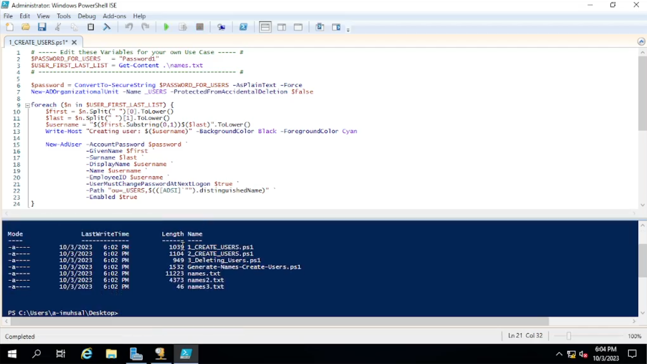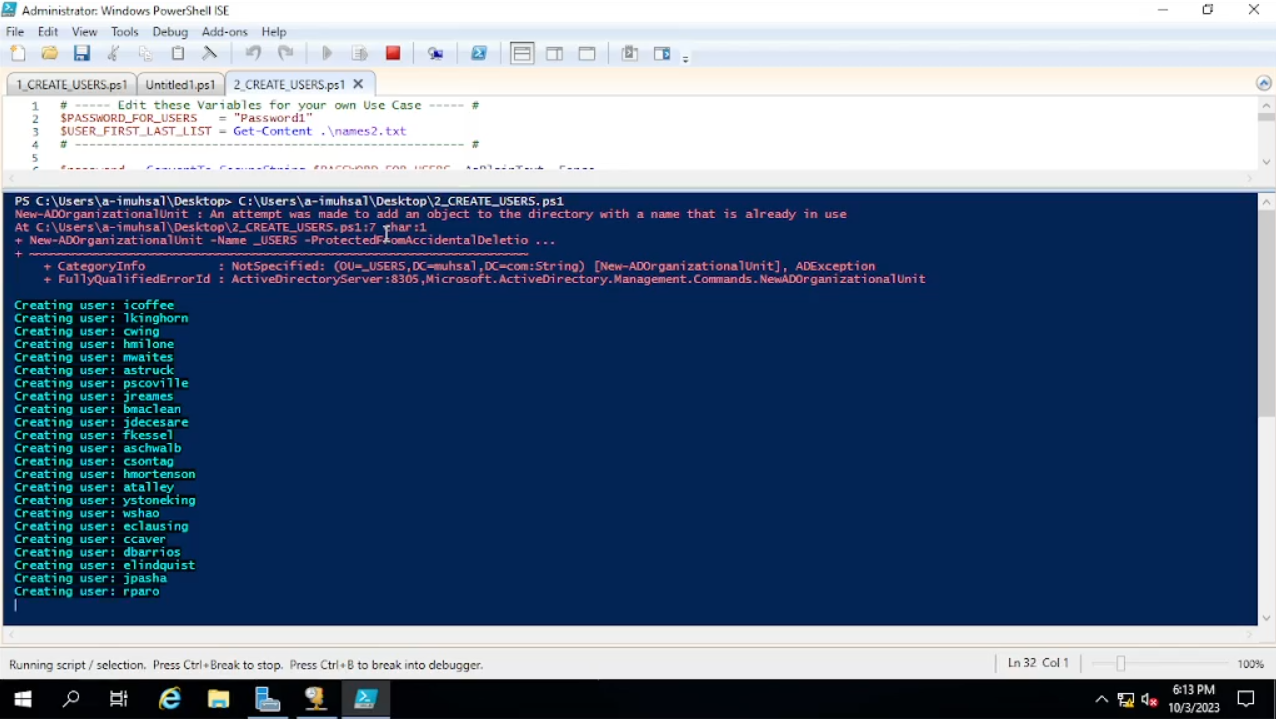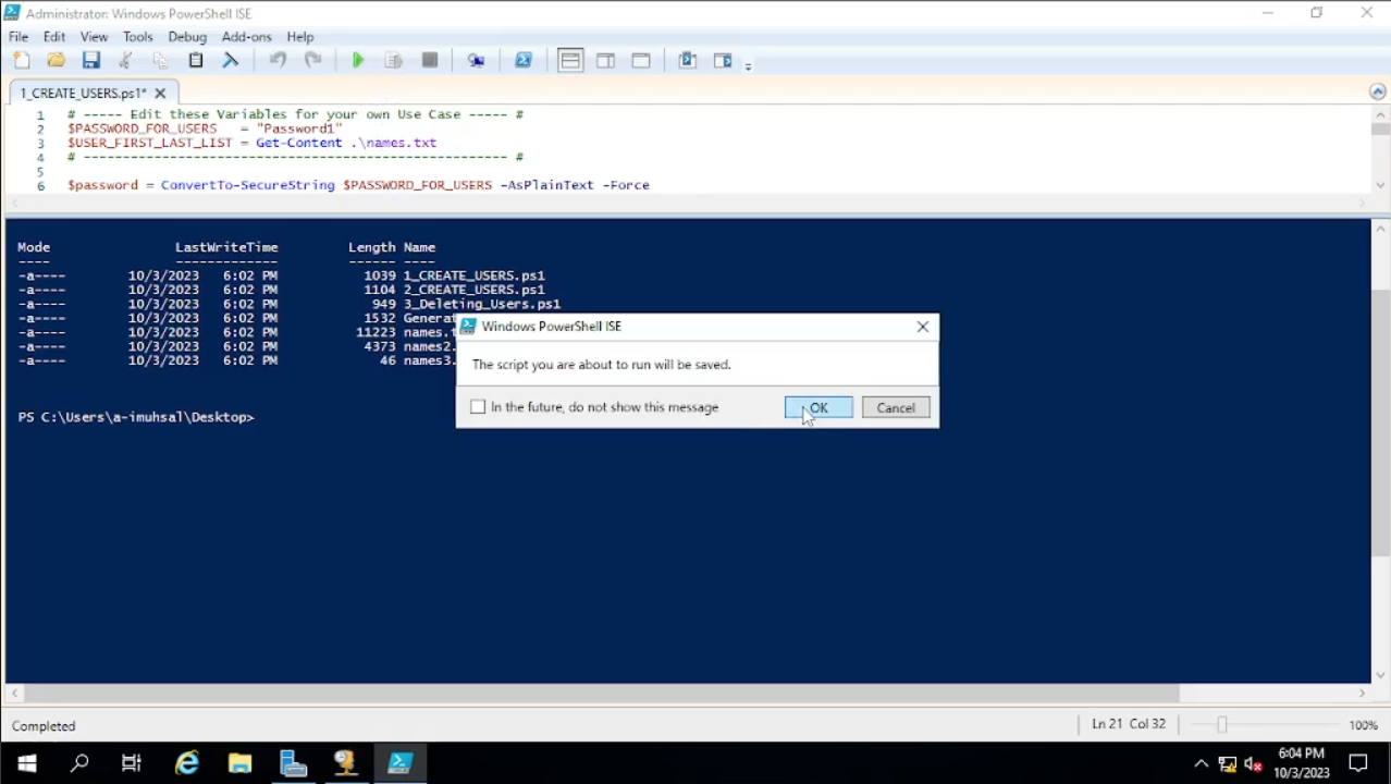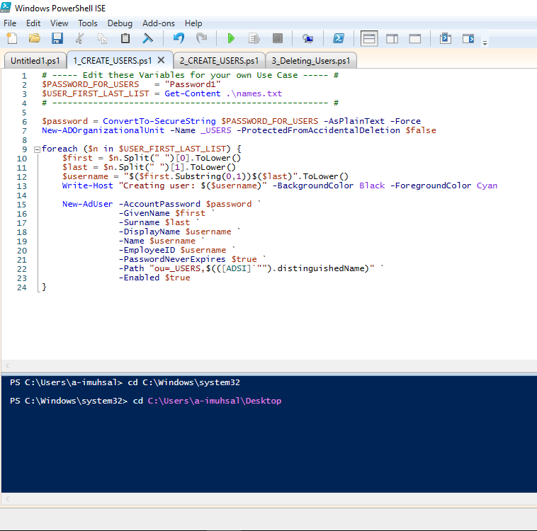 Sebelum kita “run” scriptnya, kita harus pindahkan terlebih dahulu lokasi kita di power shell ke tempat file “names” yang telah kita simpan. Saat ini kita berada di “C:\Windows\system32”, sedangkan file “names” kita berada di dekstop, kita pindahkan terlebih dahulu ke tempat file kita berada yaitu dengan mengetik “cd C:\users\a-imuhsal\Desktop” arti “cd” ini maksudnya “Change Directory”. Ketika sudah “enter”, dan coba ketikan ls “List Files”. Maka akan muncul semua file yang ada di “Desktop”, ketika muncul list files seperti names dan lain-lain mari kita jalankan script-nya dengan menekan F5 atau bisa klik ikon panah berwarna hijau. Setelah berjalan dengan sesuai kita tunggu sampai semuanya selesai.