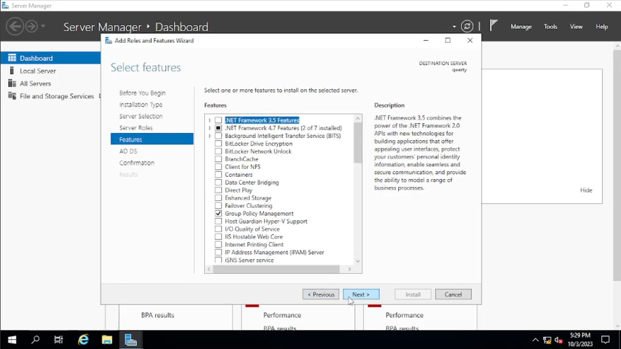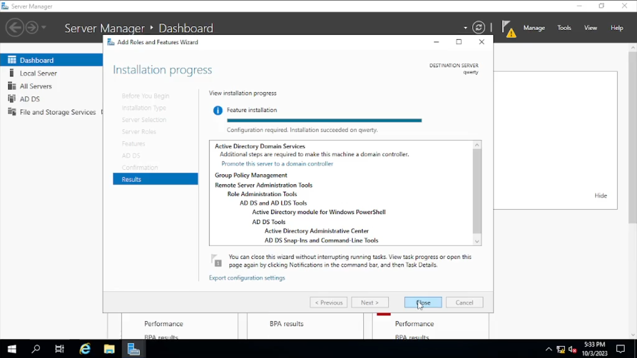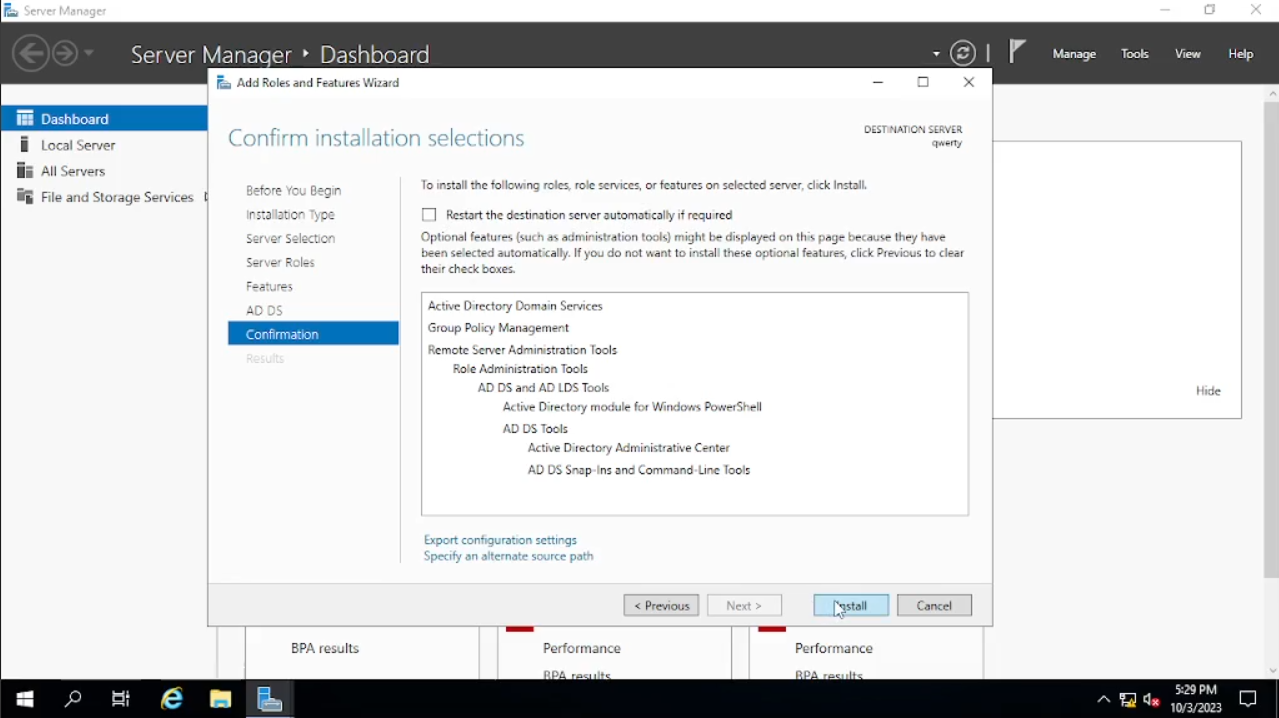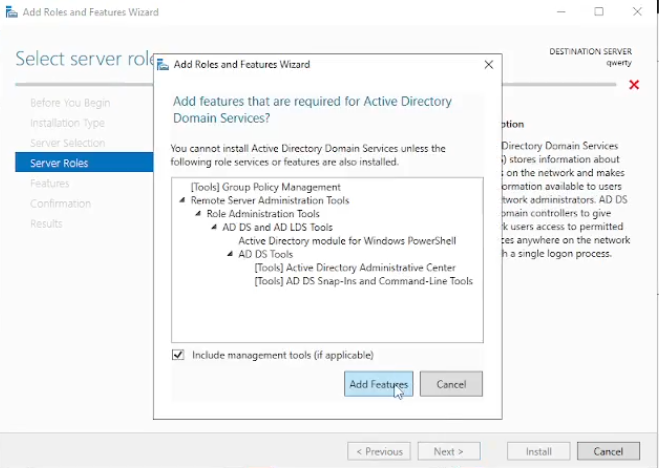 Pada bagian “Server Roles” akan ada banyak “check box” untuk saat ini kita check pada kotak “Active Directory Domain Services” lalu akan muncul windows baru klik saja pada “Add Features” lalu klik “Next”. Pada bagian “Features” langsung “Next” juga sampai pada bagian tab “Confirmation” klik “Install”. Setelah klik “Install” akan membutuhkan beberapa waktu untuk selesai, bila sudah selesai bisa kita “Close”.