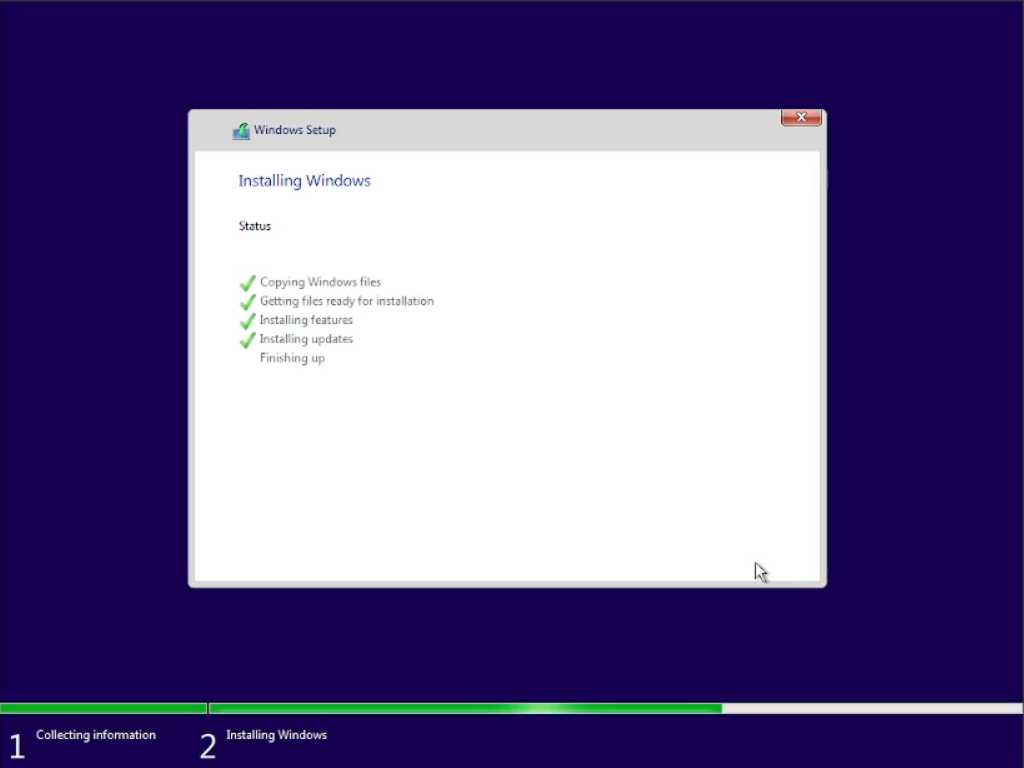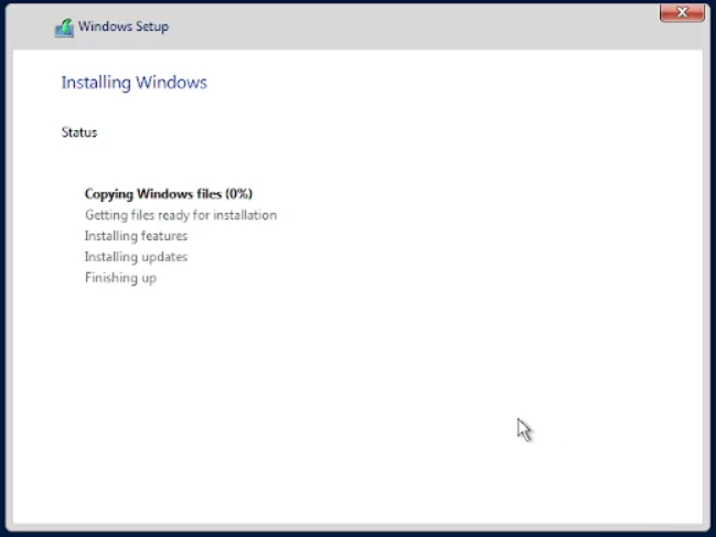 Bila menemukan seperti pada gambar di bawah tunggu saja. Karena bila di klik akan kembali lagi ke tempat kita menginstal. Bila tidak sengaja, klik close saja bila sudah sampai di windows setup, nanti akan merestart kembali.