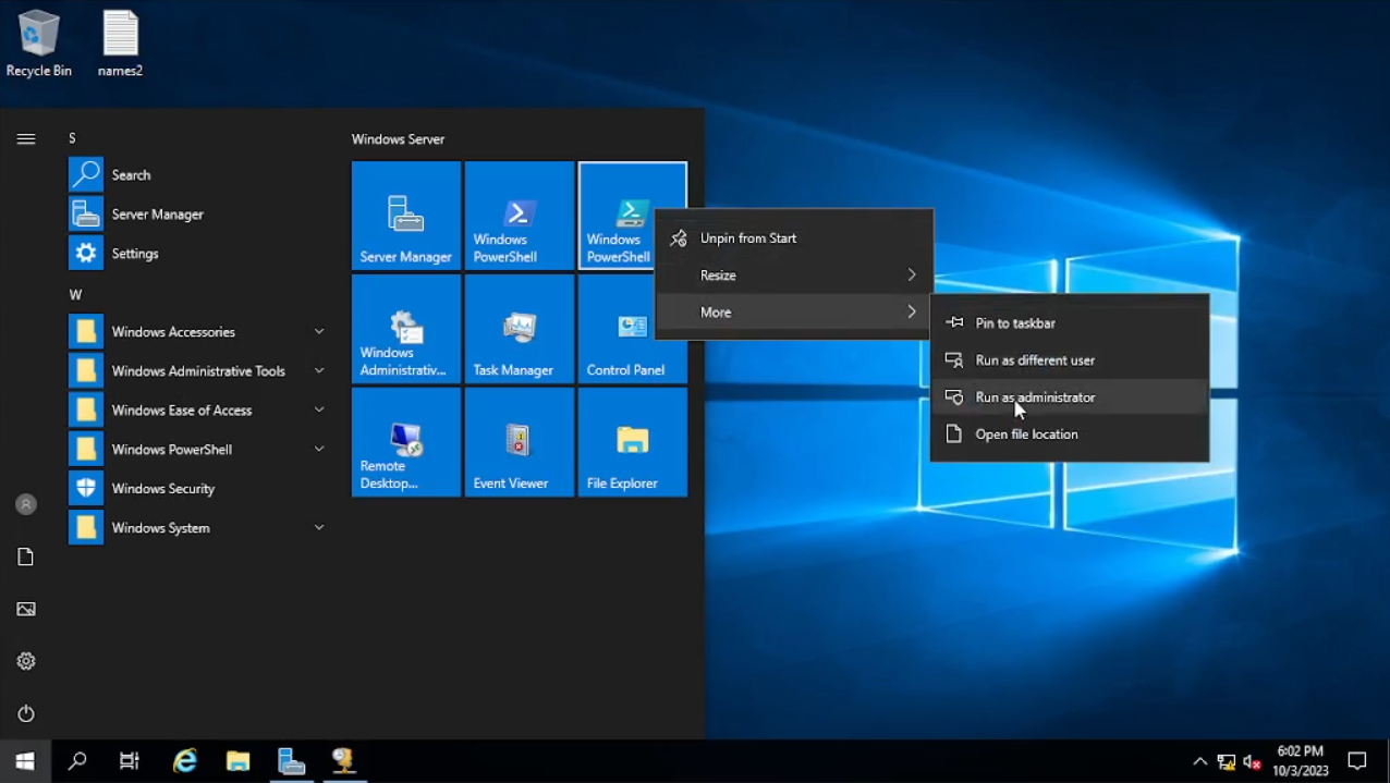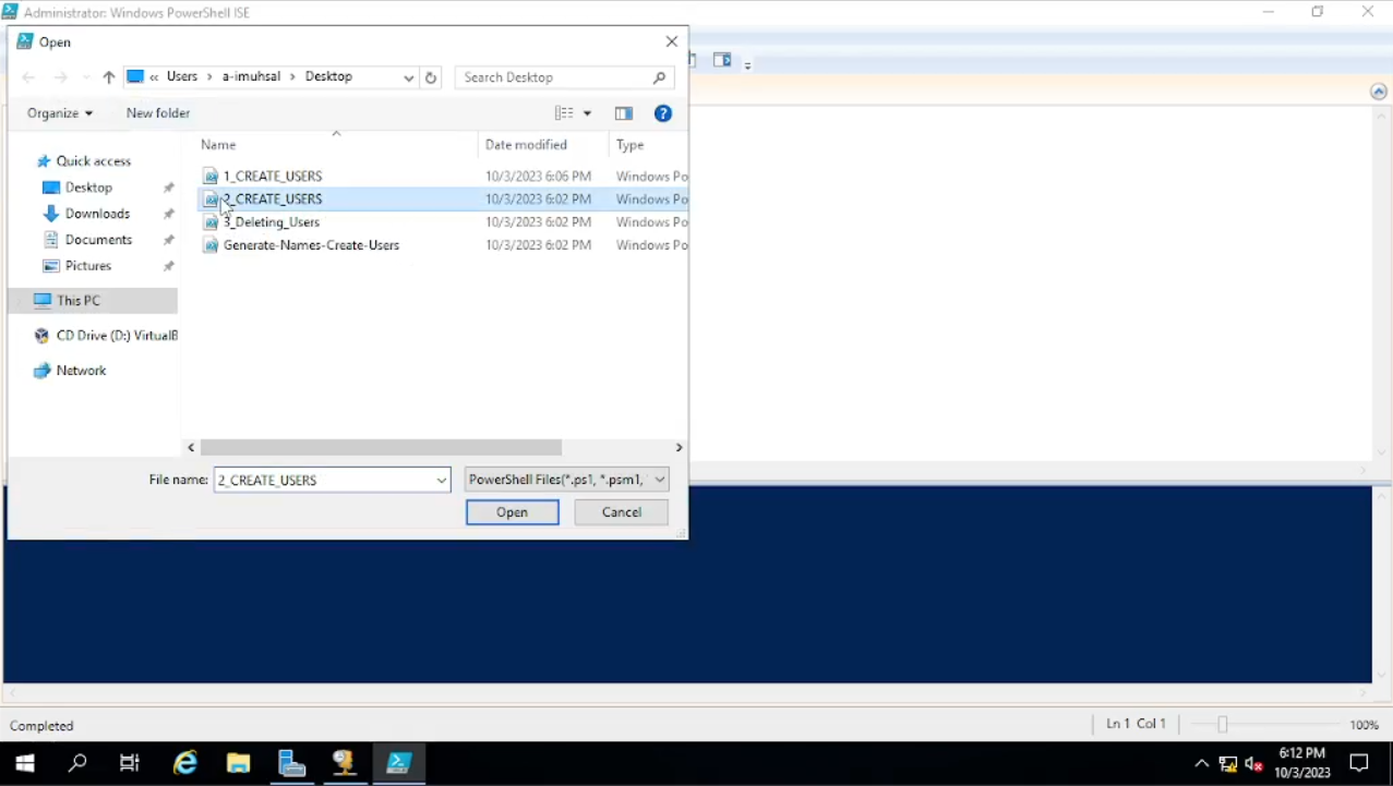 Kita akan langsung terapkan saja, klik start dan cari “Windows Power Shell ISE” dan jalankan dengan “run as administrator” lalu klik “yes”. Ketika sudah terbuka klik “Open new file” dan pilih file “1_Create_Users” kita akan bahas sedikit mengenai “script”nya. Seperti pada skenario yang telah dibuat, kita akan menggunakan file “names” pada script “1_Create_Users”. Dalam script ini default password untuk users yang akan dibuat yaitu “Password 1” Bisa kalian lihat di baris ke-2, jadi bila ingin kalian menggantinya bisa kalian ganti “Password1” dengan password yang kalian inginkan. Di baris ke-3 pada script “$USER_FIRST_LAST_LIST = Get-Content .\names.txt”. Maksud dari baris ke-3 ini kita akan mengambil data dari file “names.txt”, jadi nanti ke depannya kita hanya mengganti nama file tersebut dengan “names2” atau “names3”. Untuk mengetahui setiap barisnya berguna untuk apa, kalian bisa coba pakai chatgpt untuk menjelaskannya dengan prompt “Tolong jelaskan setiap baris script power shell ise di bawah ini (copy paste script-nya)”.