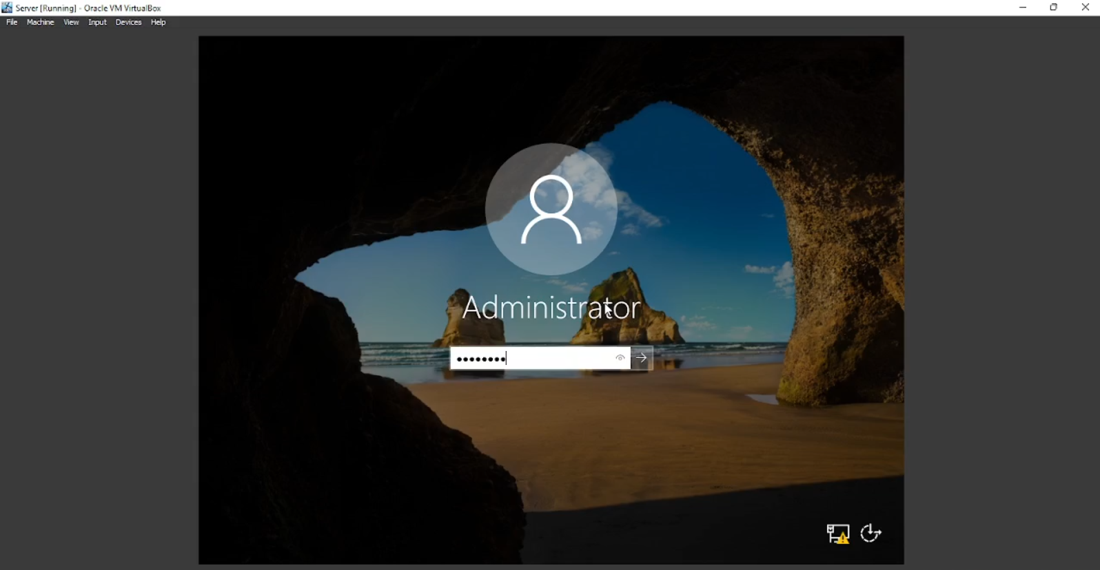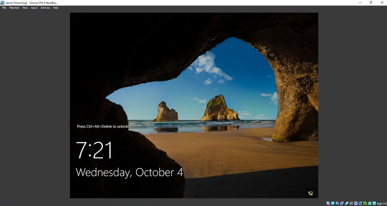 Sebelum mengkonfigurasi saya akan memberikan 1 tips untuk membuka atau meng-unlock windows server. Biasanya pada windows kila klik atau tekan tombol apapun pada keyboard seperti pada tampilan di bawah akan meng-unlock. Tetapi di sini tidak seperti itu. Tetapi bila kita mengikuti seperti yang ada pada windows server, bukannya meng-unlock malahan kita dibawa ke tampilan “Security Option” pada OS aslinya, bukan di VBox.