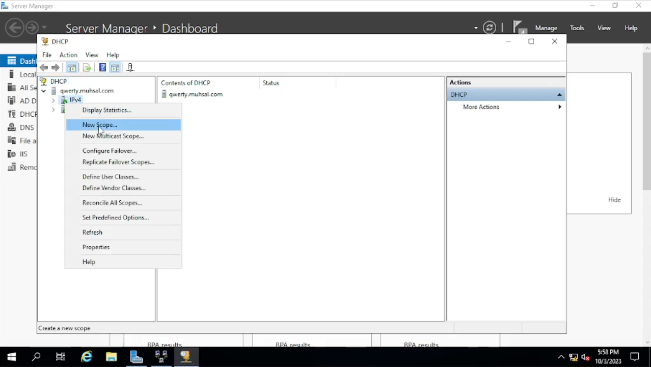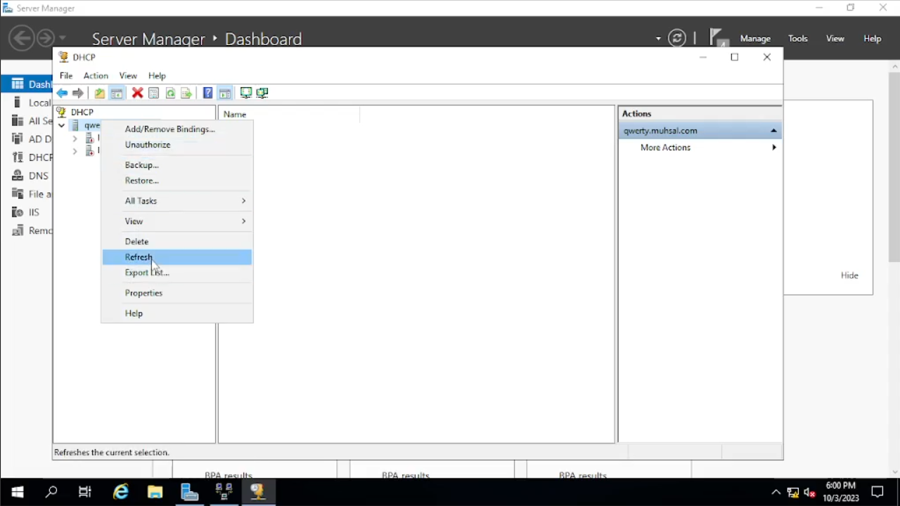 Klik tab Tools di kanan atas lalu pilih “DHCP” dan akan muncul windows baru. Klik kanan pada “qwerty” lalu kita klik “Unauthorize” lalu klik lagi “Authorize” setelah itu kita klik kanan lagi pada “qwerty” dan klik “refresh” sehingga ipv4 dan ipv6 menjadi berwarna hijau.