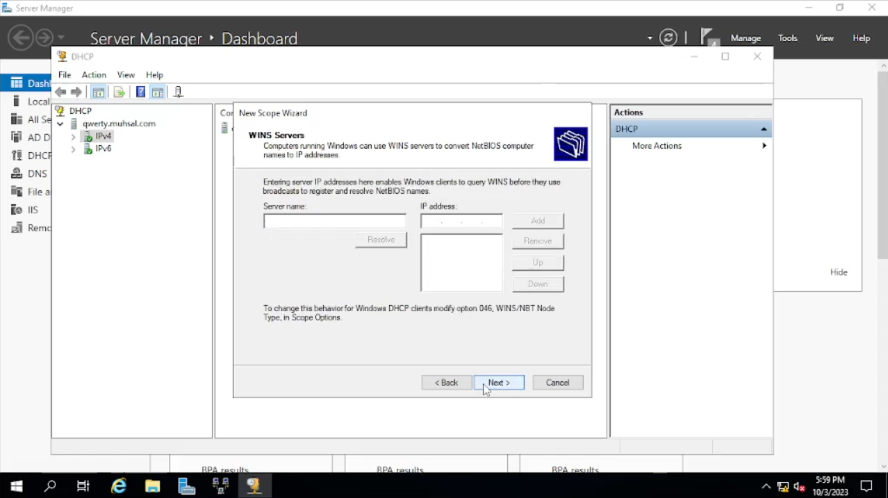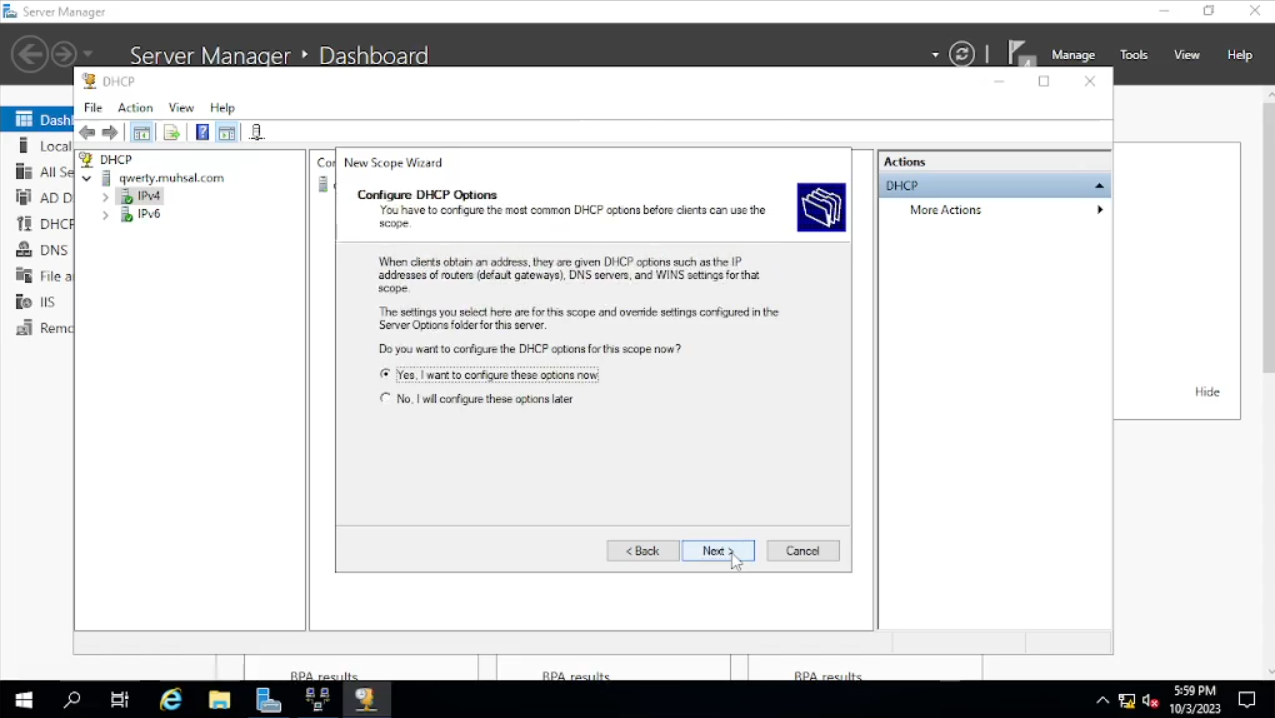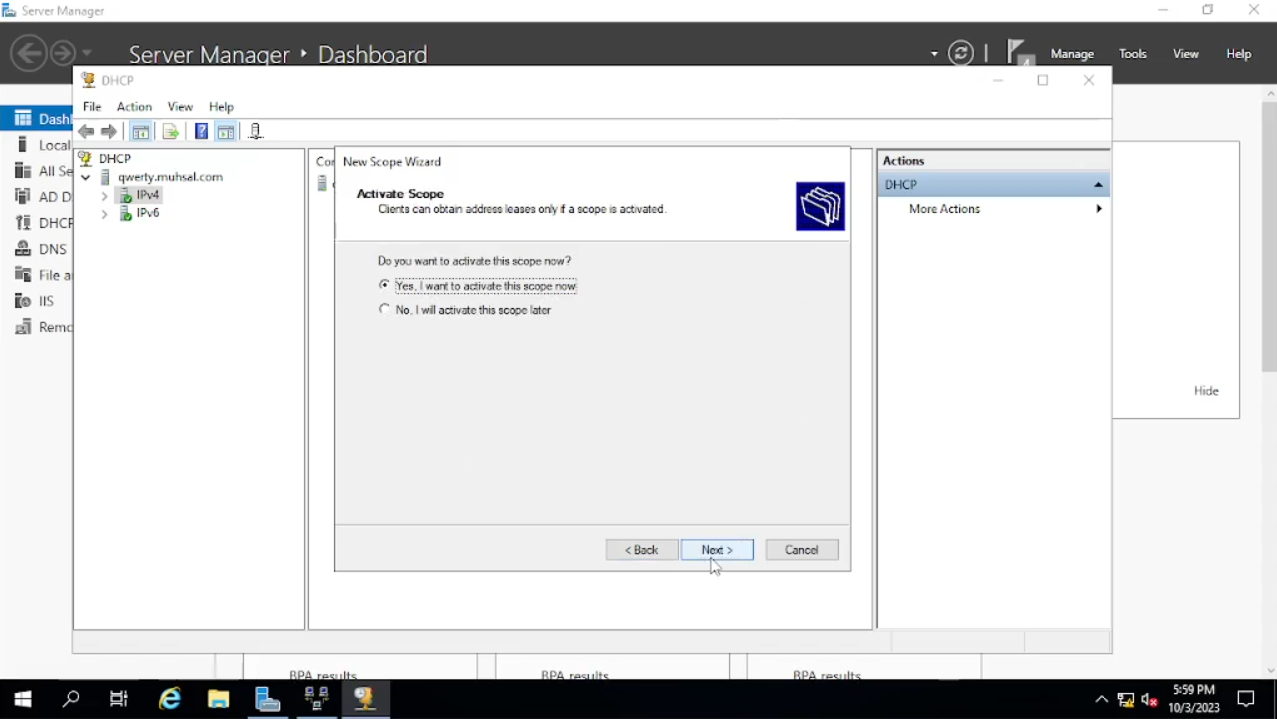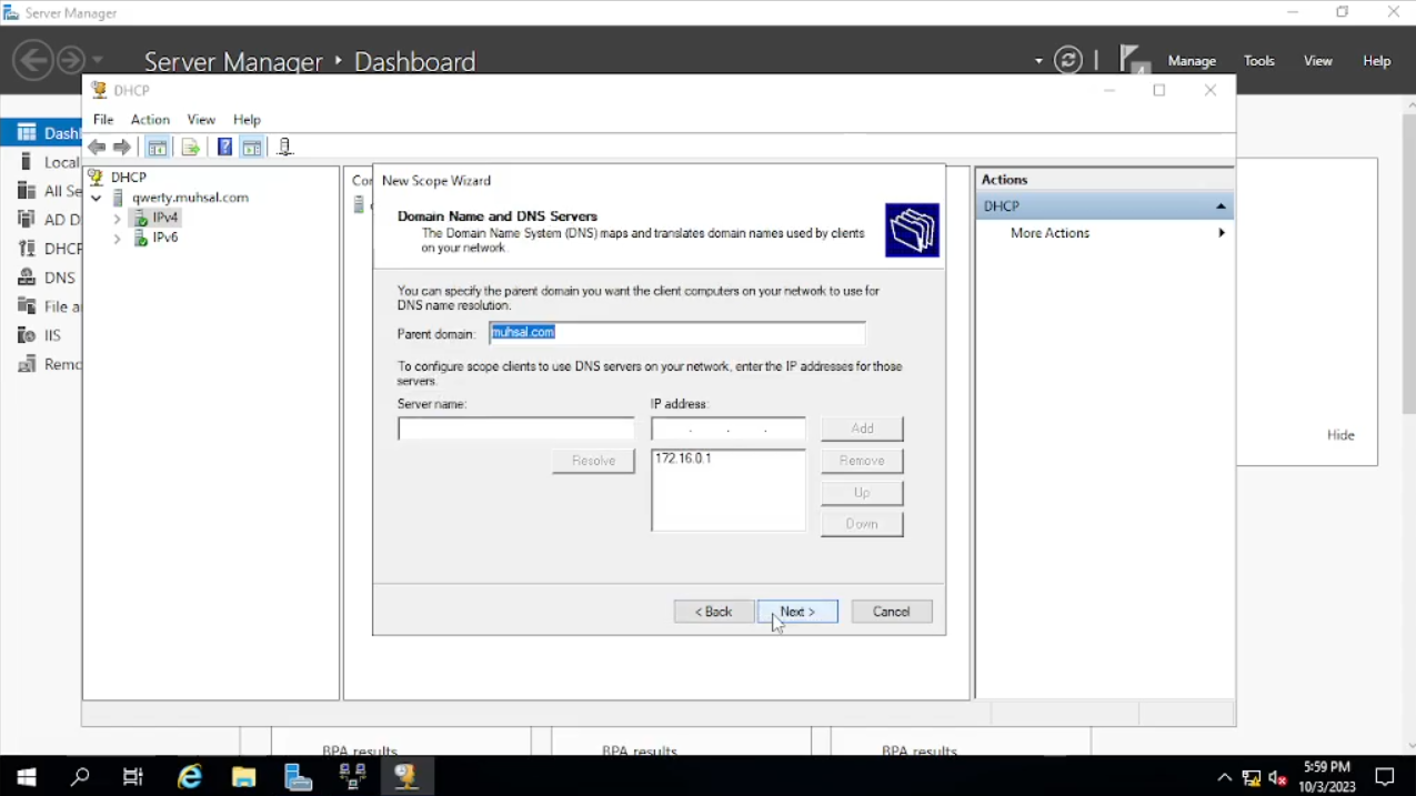 Pada bagian “Configure DHCP Options” pilih “Yes, i want configure these options now” lalu klik “next”. Pada bagian Router (Default Gateway) kita masukkan IP Address 172.16.0.1 lalu klik “add” dan “next”. Pada Bagian “Domain Name and DNS Servers” kita lewati juga dengan klik “next”. Sedangkan untuk “Wins Server” juga kita lewati langsung saja klik “next”. Untuk bagian “Activate Scope” pilih “Yes. I want to activate this scope now” lalu klik “next” dan “finish”. Setelah selesai kita refresh “IPv4” dengan cara klik kanan lalu pilih “Refresh”.