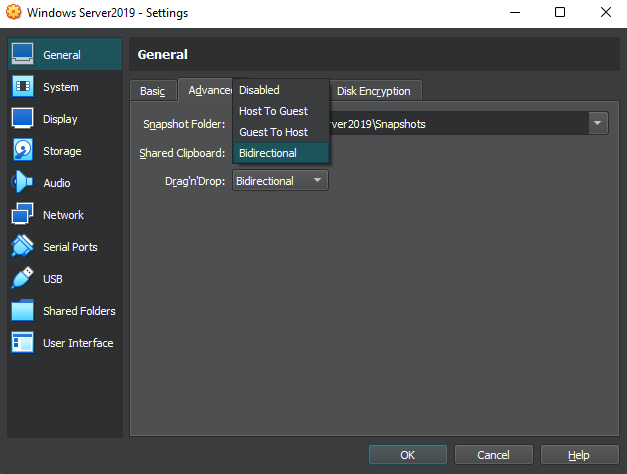 Pilih tab “advanced” yang berada pada tab “General”, ubah “Shared Clipboard” dan juga “Drag’nDrop” menjadi “Bidirectonal”. ini berfungsi agar kalian dapat mengcopy paste antar virtual box windows dengan actual windows.