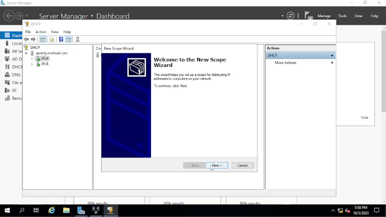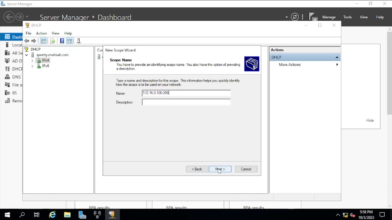 Kali ini kita akan membuat scope, di mana ini berfungsi untuk membatasi atau mengelompokkan ip mana yang akan kita gunakan dan berapa ip yang akan kita gunakan. Klik kanan pada “ipv4” lalu pilih “New Scope” setelah muncul windows baru klik “next”. Pada “name” ini kita akan menamakannya dengan ip awal dan akhir yang akan digunakan yaitu mulai dari 100 sampai dengan 200 menjadi seperti ini 172.16.0.100-200 lalu klik next.