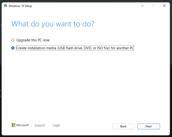 Pilih, pilihan yang kedua “Create installation media”, klik “next”