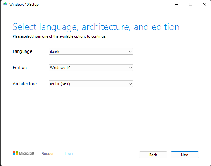 lalu pilih bahasa, edisi dan juga architecture-nya 64bit seperti pada gambar di bawah. Klik “next”.