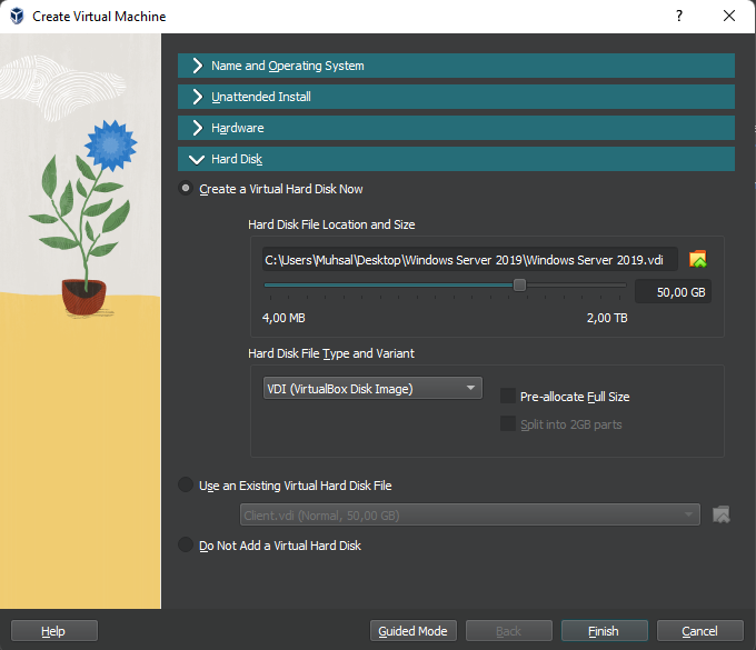 Klik Hard Disk, di situ kalian dapat memilih untuk menggunakan Virtual Hardisk atau dapat menggunakan Hardisk yang kalian punya. di sini saya menggunakan Virtual Hardisk sebesar 50GB (default). Bila sudah klik “Finish”.