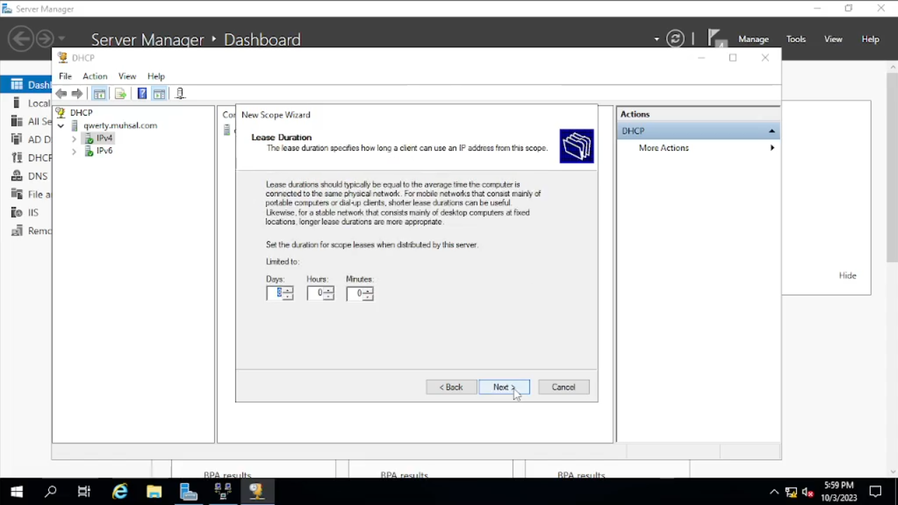 Pada bagian “Add Exclusions and Delay” kita “next” saja, sedangkan pada “Lease Duration” ini sebenarnya tergantung kebijakan perusahaannya. Maksud dari “Lease Duration” adalah berapa lama durasi si PC menggunakan IP Address yang digunakan saat ini. Karena ada juga perusahaan yang mengelompokkan beberapa IP Address untuk mengelompokkan departemen tertentu, sehingga dapat dengan mudah men-track apabila seseorang dari departemen tersebut mengalami kendala, di mana ruangannya dan di mana tepat PCnya di simpan. Jadi kemungkinan ada juga yang tidak menggunakan “Lease Duration”. Tapi di sini kita pilih default saja, langsung “next”.