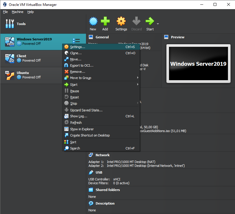 Setelah selesai semua, kalian akan mempunyai 2 OS di virtual box Windows Server 2019 dan Client. kali ini kita akan mengkonfigurasi network pada windows server dan juga windows 10. Pertama Klik kanan pada windows server lalu pilih setting.
