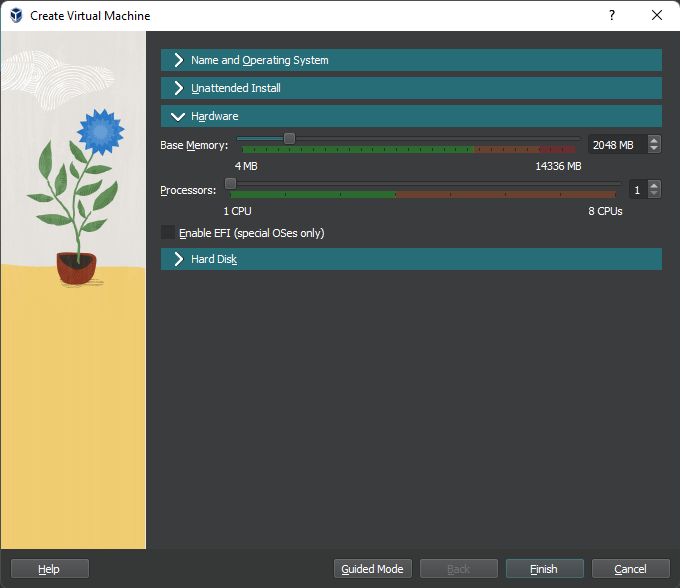 Klik “Hardware” yang ada di bawahnya, di situ bisa disesuaikan dengan kemampuan PC kalian. Di sini saya hanya menggunakan RAM 2GB dan juga 1 Core cpu.