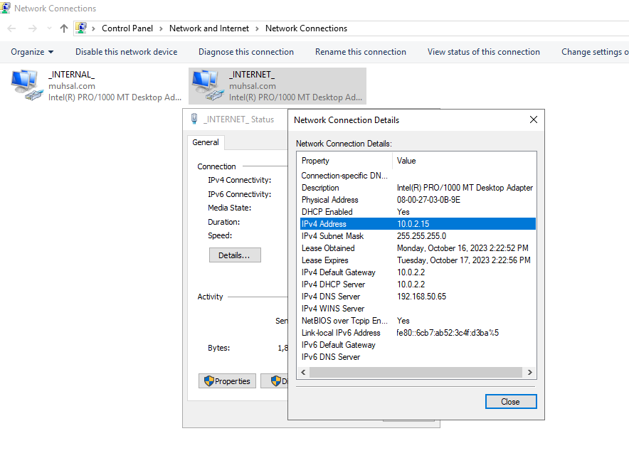 Di “Network Connections” ini terlihat ada 2 koneksi, ingat saat kita mengkonfigurasi network di VBox kita mengubah Adapter 1 menjadi “NAT” dan Adapter 2 menjadi “Internal”? nah hasilnya akan seperti ini. Lalu kita cari mana koneksi “NAT” untuk internet dan “Internal” untuk LAN dengan cara melihat IP Addres-nya. Kita coba klik kanan pada salah satu koneksi dan pilih “Status”, lalu klik “Details”. Dilihat IP4 Address kita di sini 10.0.02.15, ini merupakan IP Address untuk internet, kita bisa “Rename” koneksi tersebut dengan nama “internet” atau bebas semau kalian, dan yang satunya lagi bisa di”Rename” menjadi “internal”. Karena ini akan memudahkan kita ke depannya membedakan mana koneksi internet dan mana koneksi internal atau LAN.