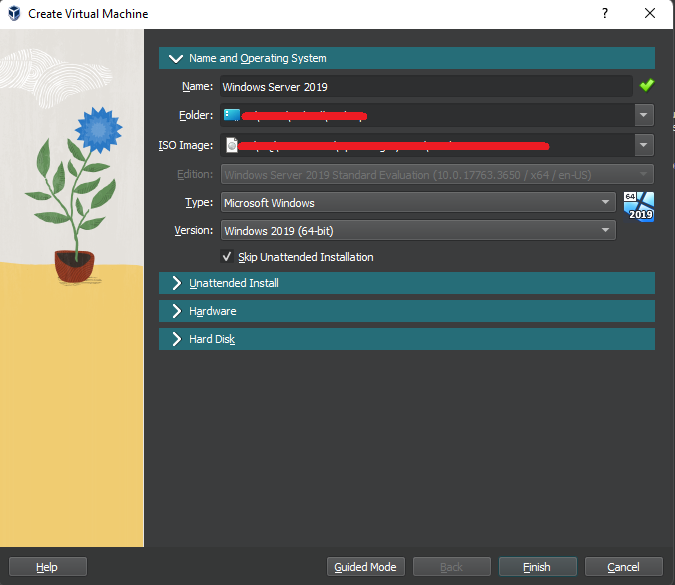 Kita klik “New” untuk membuat Virtual OS, lalu kalian dapat berikan namanya apa saja, di sini saya menamakannya dengan “Windows Server 2019”, lalu pilih di mana akan kalian simpan Windows Servernya dan juga pilih ISO Windows Server 2019 yang sudah di download. Kemudian ceklis check box “Skip Unattended Installation”