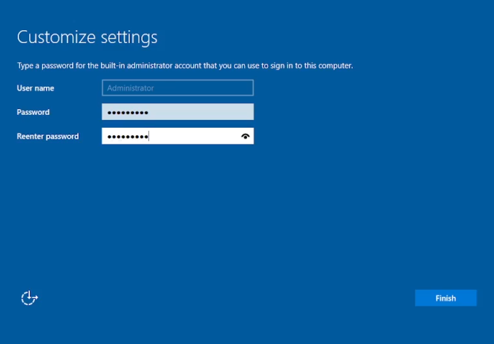 Tampilan awal ketika selesai menginstal akan seperti ini, di sini kita disuruh untuk mengisikan password. Isikan saja bebas, saya menggunakan “Password1” biar tidak ribet. Untuk User name memang dari sananya tidak bisa diubah. Langsung saja klik “Finish”. Nah di sini kita akan memulai mengkonfigurasi Windows Server.