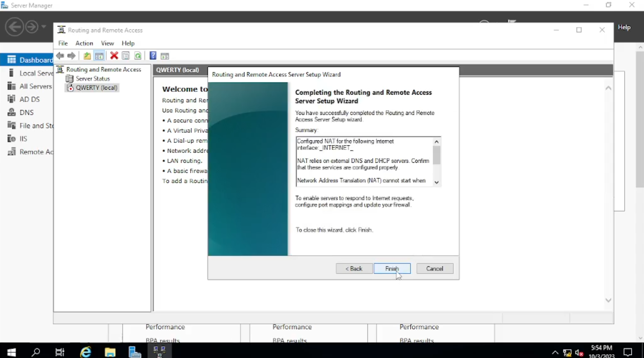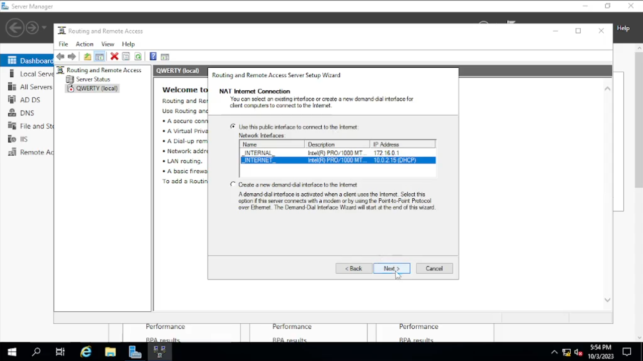 Selesai menginstal, klik tab “Tools” dan pilih “Routing and Remote Access” dan akan muncul windows baru. Klik kanan pada “qwerty” pilih “Configure and Enable Routing and Remote Access”, setelah itu kita “next”. Terlihat banyak pilihan, untuk ini kita pilih “NAT” lalu next. Bila sudah next dan ternyata pada pilihan pertama yaitu “User public interface to connect to the internet” tidak bisa dipilih seperti pada gambar, kita “cancel” dan coba ulangi lagi. Klik kanan pada “qwerty” pilih “Configure and Enable Routing and Remote Access”, pilih “NAT” terus “next” dan tampilannya seharusnya kita dapat memilih pilihan pertama. Karena di sini untuk kita dapat mengakses internet kita pilih “_INTERNET_” inilah fungsi merename koneksi sehingga kita mudah untuk mengenali mana jaringan internet dan lokal. Klik “next dan “finish”.